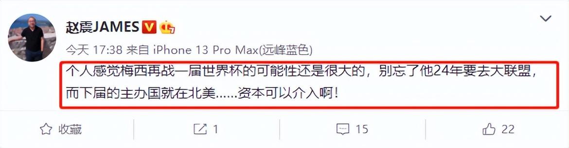 国内名嘴赵震:感觉梅西参加下一届世界杯的可能性很大,他在2024年要去大联盟,而下一届的主办国就在北美,资本可以介入! 卡塔尔世界杯已经结束了,阿根廷队以7-5击败法国队拿到大力神杯,梅西依靠在决赛中梅开二度,夺得了本场比赛最佳球员。而且,在世界杯7场比赛里,梅西打进7球,平均每场1球,效率也非常高,他还顺利拿到世界杯金球奖,当然,含金量最高的还是世界杯冠军奖杯,35岁阿根廷球王一战封神,他已经是足坛Goat了,应该没有悬念,像马拉多纳和贝利等传奇球星,在俱乐部荣誉和金球奖数量上,难以和梅西相提并论。 在本届世界杯还在进行的时候,梅西已经向外界表示,这会是他最后一次参加世界杯,如今终于圆梦,在外界看来,梅西甚至可能从国家队退役。不过,在捧杯之后,梅西非常兴奋,他计划以世界冠军的身份继续为阿根廷出战,参加下一届美洲杯的可能性很大。而2026年的美加墨世界杯,梅西会参加吗?国内名嘴赵震在社媒上分析,梅西大概率会继续参赛。 赵震写道,“个人感觉梅西再战一届世界杯的可能性很大,别忘了他在2024年要去大联盟,而下届的主办国就在北美,资本可以介入啊”。4年之后,梅西已经39岁,处于职业生涯末期,不过,考虑到他现在还是足坛最好的球星,再过几年,梅西仍旧能够为阿根廷队做出贡献。而且,梅西可能会离开大巴黎去美国职业足球大联盟,如果真的实现的话,那梅西参加美加墨世界杯的可能性大大提升。 2026年世界杯由美国、加拿大和墨西哥联合举办,如果梅西去美国踢球,如果有资本介入,想要让世界杯的热度提升到新的层次,很可能会说服梅西参加比赛。毫无疑问,不管到什么时候,梅西都是体坛流量最大的运动员,甚至已经超过C罗。如果他参加4年之后的世界杯,肯定会受到极大关注。 而且,梅西现在的计划也是继续为阿根廷效力,不会从国家队退役,几年之后,如果他自己的身体状态依旧很不错,竞技水准也没有下滑太多,那就可能参加2026年世界杯,争夺职业生涯第二座大力神杯。而且,阿根廷主帅斯卡洛尼也已经表态,如果梅西愿意参加下一届世界杯,愿意给他留一个位置。 接下来,梅西会休息几天,在阿根廷接受球迷的欢呼,和家人们度过愉快的时光后,就会和大巴黎的队友们相聚,为联赛做好准备。梅西和姆巴佩在世界杯赛场是对手,而在大巴黎则是队友,他们下一次相见,会聊些什么,相信也会有不少人关注。