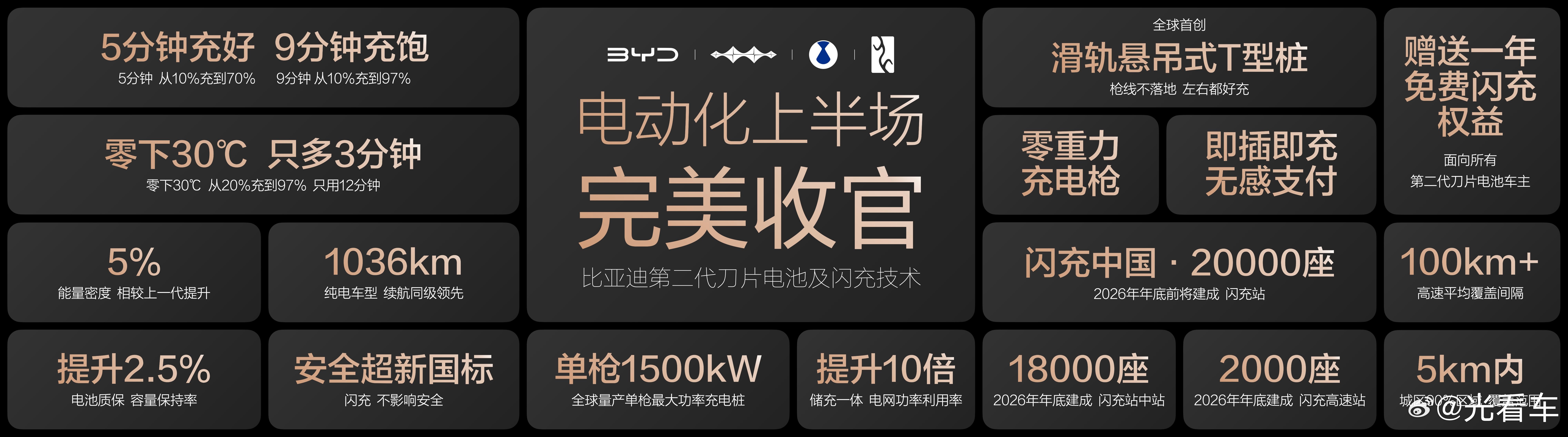 作为全球电动车的领跑者,比亚迪每一次技术发布,都改写着世界新能源车发展进程,这一次更不例外。刚刚发布的第二代刀片电池、闪充技术硬核破局行业痛点,彻底解决了消费者最头疼的两件事——续航和补能,1000公里续航信手拈来,9分钟补能轻松拿捏,即便零下30度,也不过是再多等3分钟。如果你认为这只是一次普通的技术发布会,那就太小看比亚迪了,王传福擘画的比亚迪新能源王国版图已经全面成型。随着第二代刀片电池、闪充技术上车,比亚迪成为全球第一家实现从锂电原材料、电池制造到新能源车整车研发、制造、销售,直至闪充充电桩等新能源车全产业链企业,全面掌握新能源车的每一个核心技术,构建了其他车企难以逾越的护城河,其影响力和威力将在今年展现出断崖式的领先优势。这种全产业链架构能够不再被他人“卡脖子”,2021年汽车市场“缺芯少电”,全行业处于半停产状态,唯有比亚迪凭借全产业链优势抵抗住行业风险,籍此登顶全球新能源第一宝座,直到今天。这种底气,来自于雄厚的技术底蕴。十多万人的研发队伍,千亿元级别的研发投入,比亚迪技术鱼池“大鱼”不断,超级混动已经迭代到6.0,刀片电池来到了二代,易四方、云辇、天神之眼等等更是位列行业前茅。经过二十多年的发展,比亚迪已经蜕变为一家具备极强前瞻性的新能源科技企业,而非传统汽车制造商。如果说全产业链让比亚迪抗风险能力进一步增强,那么,闪充站全国落地则打开了充电站的盈利空间,激发了社会资金建站热情。不同于其他品牌的超充桩,投入大、盈利慢,闪充站以储能柜+充电桩来增大充电功率,储能柜可以平抑波峰、波谷电价,让闪充站快速实现盈利,这对于合作伙伴来说,无异于送钱。闪充站第一次真正形成赚钱效应,促进社会各界力量主动参与到兆瓦闪充站的建设中来。为什么充电站只有“闪充”二字,而没有标注“比亚迪”,目的就是要让各方资本进入到充电桩建设中来。对于比亚迪来说,就地改造的成本并不高,储能柜就地取材,使用车用磷酸铁锂电池组,散热装置则来自于车用空调,既降低电站成本,又保证了运行可靠性,这种优势也只有比亚迪才能独享,放眼全世界,也是独一无二的存在。关键是,闪充站不会增加电网负荷,遍布全国的储能柜,还能在特殊情况下发挥应急作用。此前,很多人看不明白,作为新能源车保有量最大的厂家,为什么不自建充电桩呢?现在能看明白了吧?建设自己制定标准的闪充桩,不受制于人,更有望成为充电桩的行业标准。最后是补能出海。闪充技术提升了全球充电站标准,让世界感受中国充电速度带来的快速和便捷。中国新能源车遍布世界各地,但对于带给客户用车感受的充电桩,却一直是中国车企还不能触达的最后“一公里”。现在,比亚迪闪充站同样可以像新能源车一样,向世界不同国家和地区输出技术,抑或合作、独立建站,通过快速补能,进而提升比亚迪产品的美誉度,形成与汽车产品的正相关。而这,恰恰是企业友商做不到的环节。对于比亚迪来说,第二代刀片电池、闪充技术带给消费者的超强体验感只是第一步,更大的雄心,王传福在发布会上说的明明白白——闪充中国,改变世界。