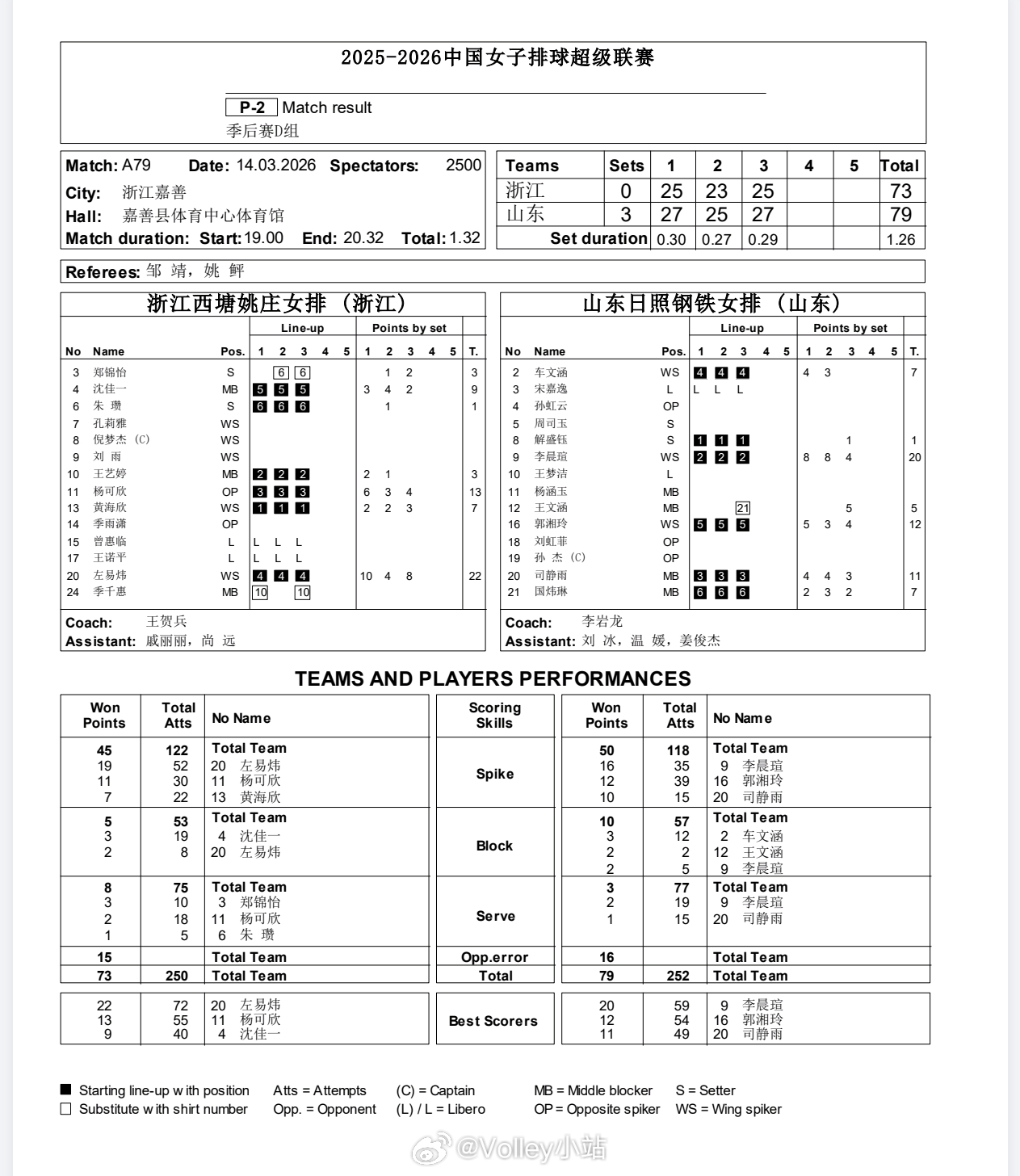 【技术统计】排超联赛季后赛第6轮,浙江女排0比3山东女排(25-27 23-25 25-27)