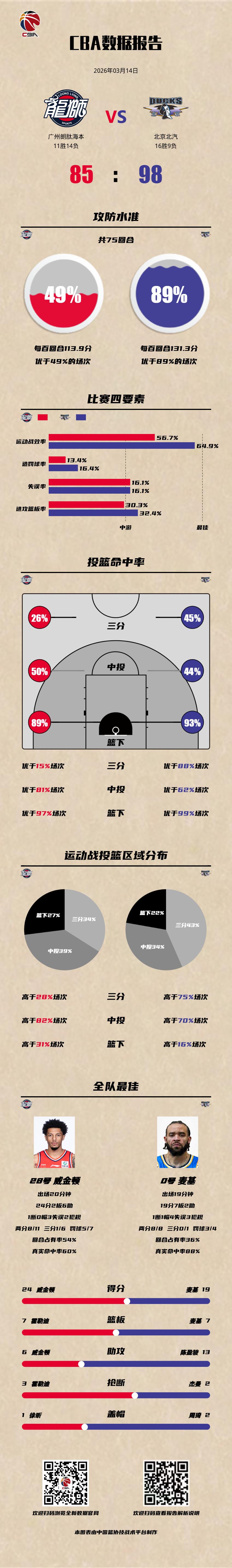 广州朗肽海本 85-98 北京北汽 龙狮男篮vs北京男篮 广州朗肽海本:威金顿24分6助攻,伯顿19分3篮板4助攻2抢断,徐昕10分6篮板; 北京北汽:麦基19分7篮板,方硕18分,陈盈骏13分5篮板13助攻2抢断。以城之名