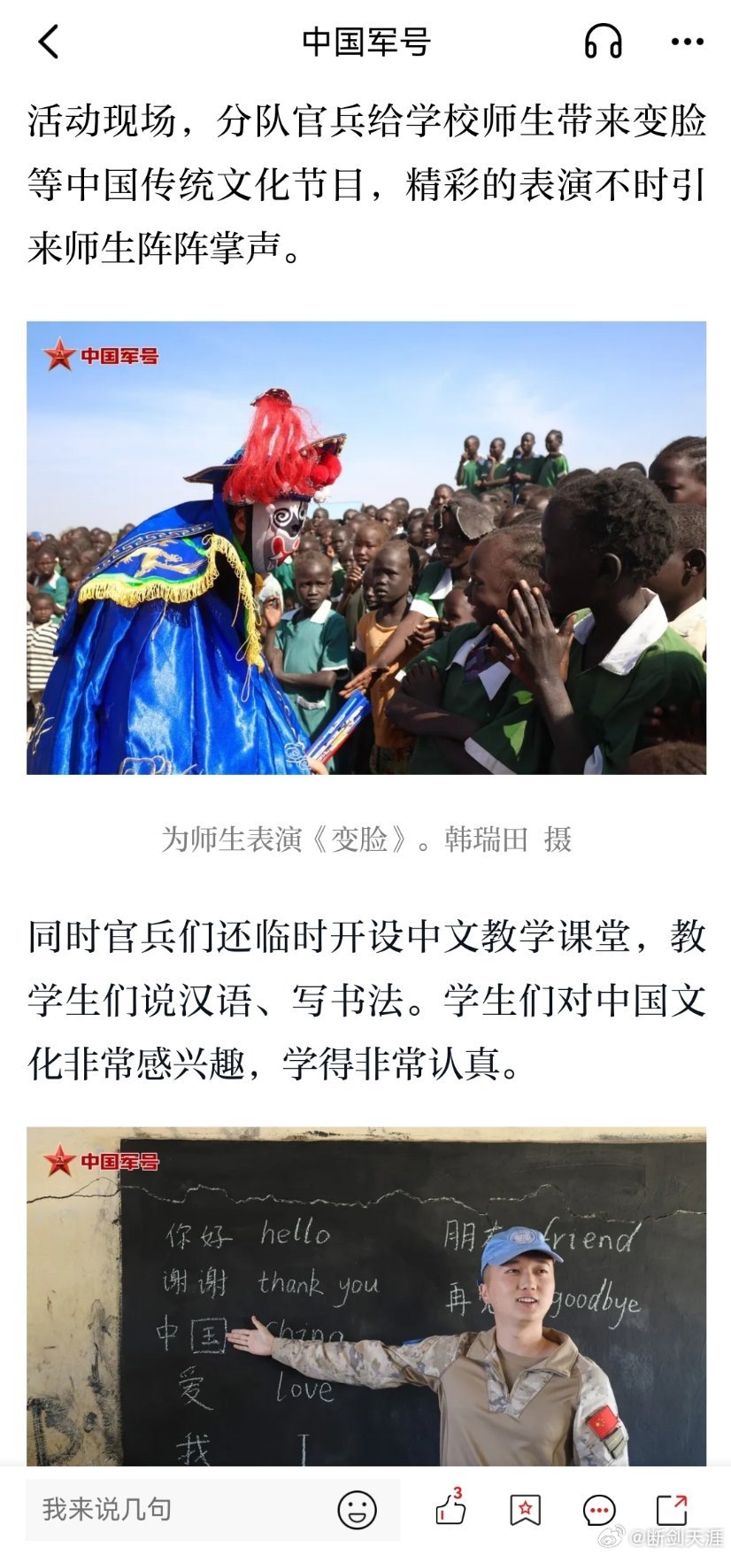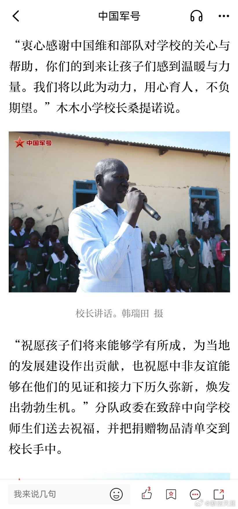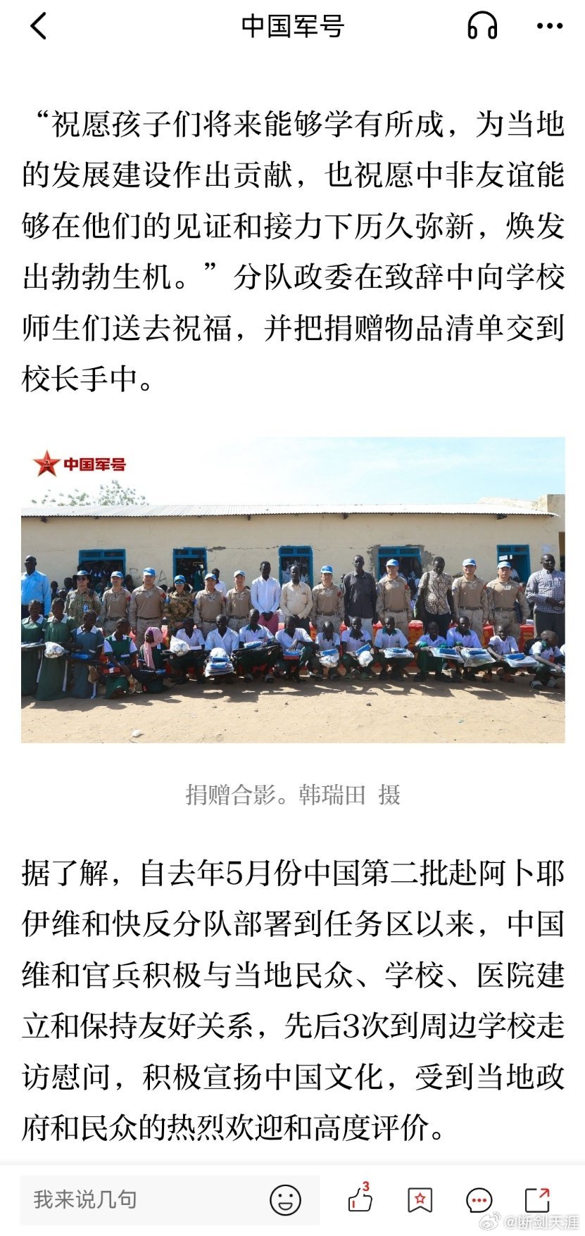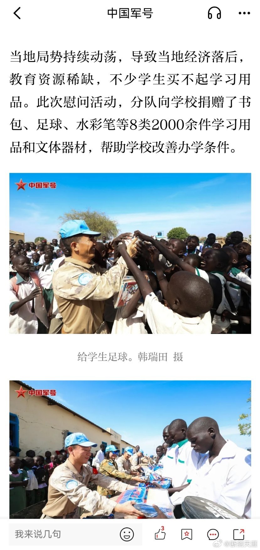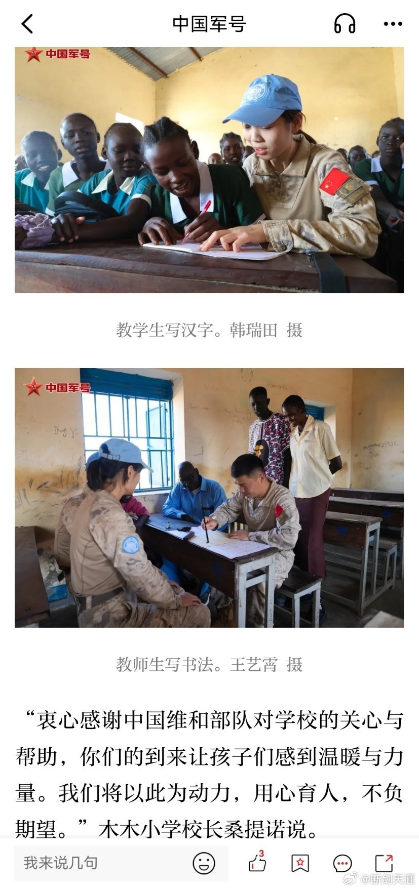 精忠蓝盔致敬中国蓝盔致敬中国军人 中国第二批赴阿卜耶伊维和快反分队到当地小学开展助学慰问活动