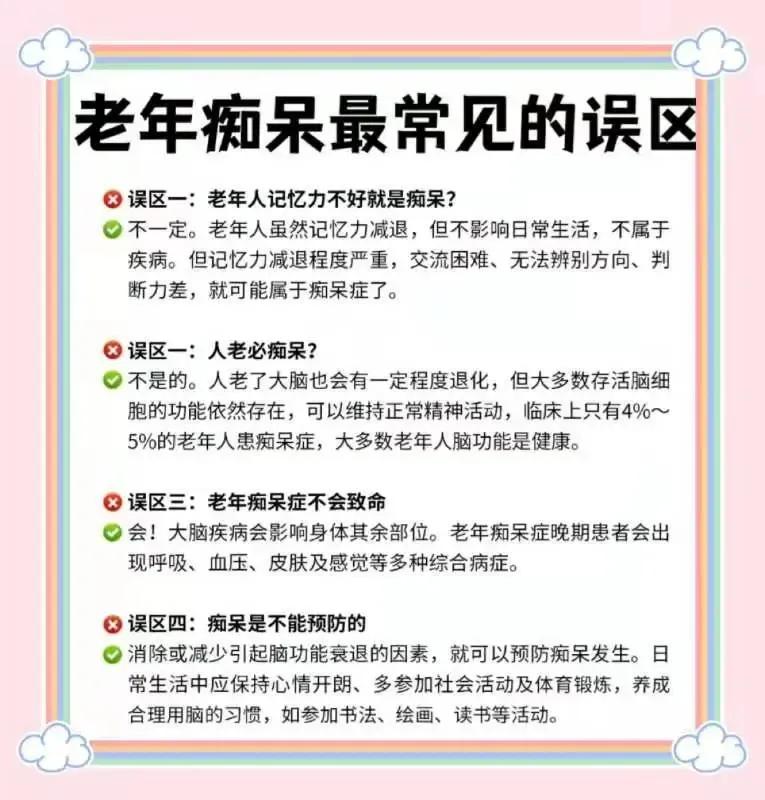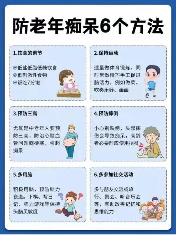 先把最关键的一句话说清楚: 老年痴呆(阿尔茨海默病为主)目前还不能彻底根治,但可以做到:延缓进展、减轻症状、提高生活质量、减轻家人负担。 下面给你一套最实用、最靠谱、马上能用的综合方案。 一、医学上最核心的解决办法 1. 一定要先确诊 去神经内科/记忆门诊做: - 认知量表(MMSE、MoCA) - 脑CT/MRI - 必要时验血排除甲减、维生素B12缺乏、中风等可治愈的“假性痴呆” 2. 规范用药(遵医嘱) 常用两类(不能自己乱吃): 1. 胆碱酯酶抑制剂 多奈哌齐、卡巴拉汀、加兰他敏 → 改善记忆力、注意力、日常生活能力 2. NMDA受体拮抗剂 美金刚 → 适合中重度,减轻躁动、幻觉、行为问题 作用:不是“治好”,是减慢变差、稳住状态。 二、非药物:效果非常关键(很多人忽视) 1. 认知训练(每天坚持) - 简单算数、认字、读报、记电话号码 - 拼图、纸牌、填字游戏 - 重复做固定日常流程:起床→洗漱→吃饭→散步→午休 2. 身体活动(比你想的更重要) - 每天快走30分钟 - 太极、广场舞、简单伸展 → 能明显延缓脑萎缩、改善情绪、减少跌倒 3. 睡眠 & 情绪 - 痴呆常伴焦虑、抑郁、夜间吵闹 - 严重时医生会用安全的抗抑郁/镇静药,不是随便吃安眠药 4. 营养 - 多:鱼、坚果、橄榄油、蔬菜、水果 - 少:高糖、高油、高盐 - 补:维生素B族、D、Omega-3(先验血再补) 三、家庭照护:最能“解决痛苦”的部分 1. 环境简单化 - 少杂物、固定物品位置、贴标签 - 防走失:戴定位手环、随身卡片 2. 沟通方式 - 慢、短、简单句 - 不反驳、不纠正、不吵架 → 能大幅减少暴躁、哭闹、抗拒 3. 防并发症 - 防跌倒、防肺炎、防营养不良、防褥疮 → 晚期痴呆大多不是死于痴呆本身,是并发症 四、你最关心的:有没有“最好、最快”的办法? 综合排序(从最有效到次要): 1. 早诊断 + 规范用药(基础中的基础) 2. 每天运动 + 认知刺激(延缓速度最明显) 3. 科学照护 + 情绪稳定(生活质量提升最大) 4. 控制三高、戒烟限酒、睡眠规律晚年痴呆症