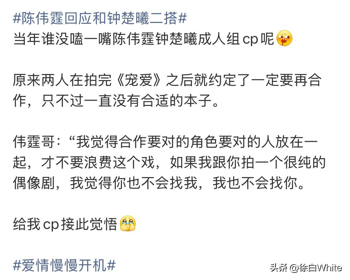 3月14日,陈伟霆钟楚曦二搭新剧开机 陈伟霆分享这次合作是7年前就约定好的! “合作要对的角色,对的人,才不浪费这个戏,如果我跟你拍一个很纯的偶像剧,我觉得你也不会找我,我也不会找你。”,这些年一直没遇到合适的剧本,直到这部剧的出现,陈伟霆钟楚曦的约定缘于7年前两人在拍摄电影《宠爱》期间加入了非常多两人二创内容,我现在都记得看这部电影用掉了很多纸巾,太催泪了,拼盘电影,陈伟霆钟楚曦只是其中一对主角,想二搭,是因为没拍过瘾吧,他俩特别有cp感!