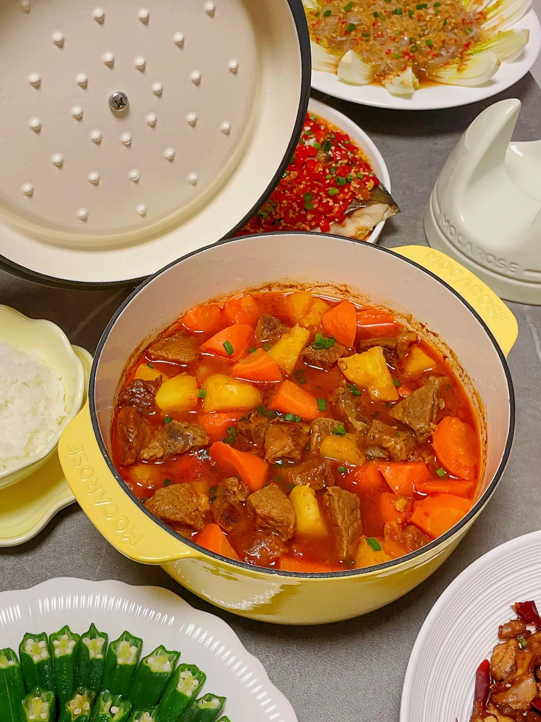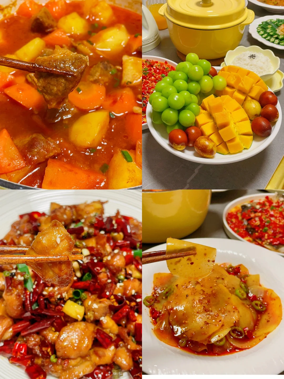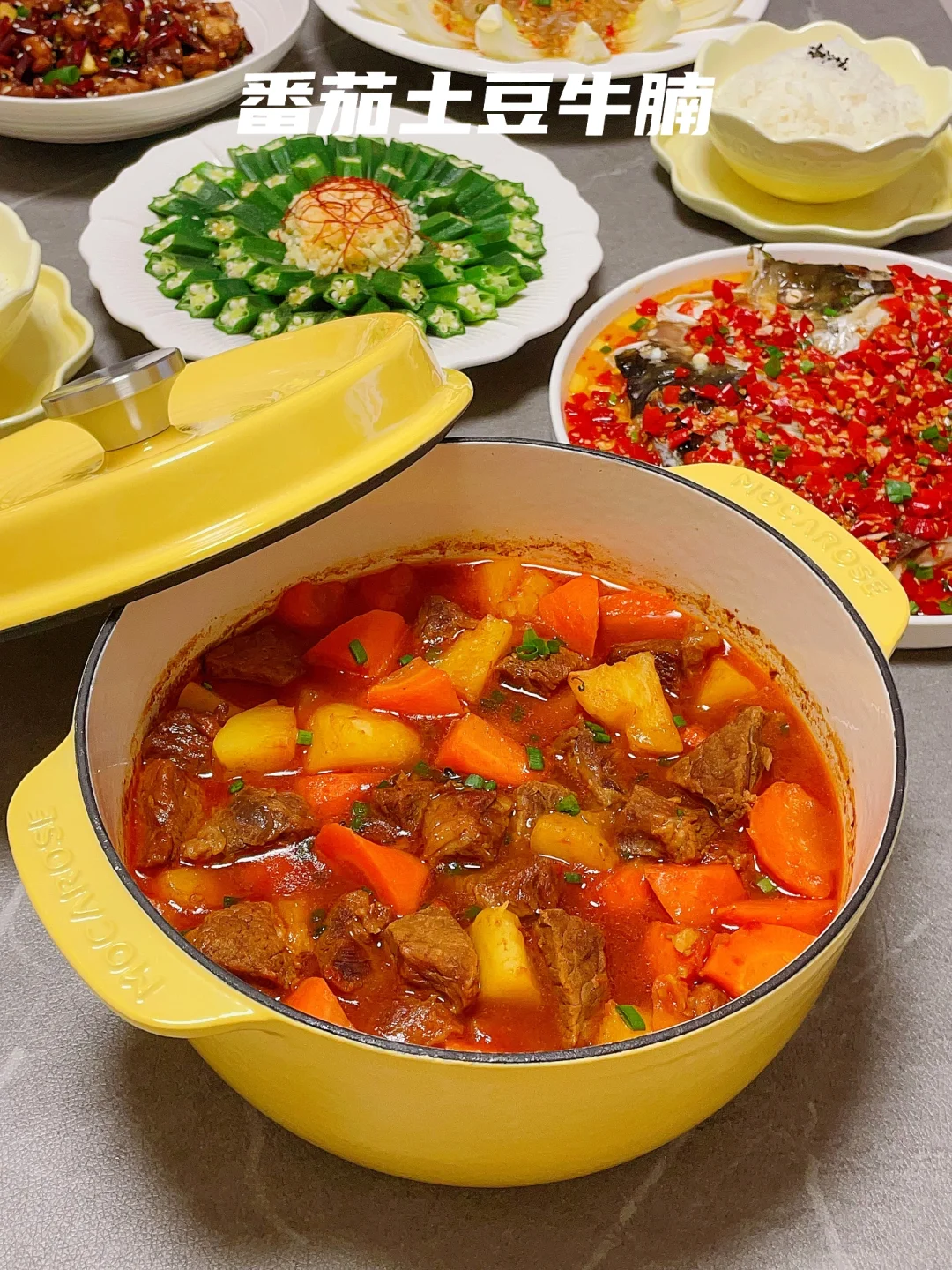 🍅熟透了的番茄拿来炖牛肉味道简直太棒了,用珐琅锅小火慢炖,锁水蓄热好,牛肉软烂入味。剁椒鱼头和辣子鸡也是简单快手的硬菜,下饭又下酒。