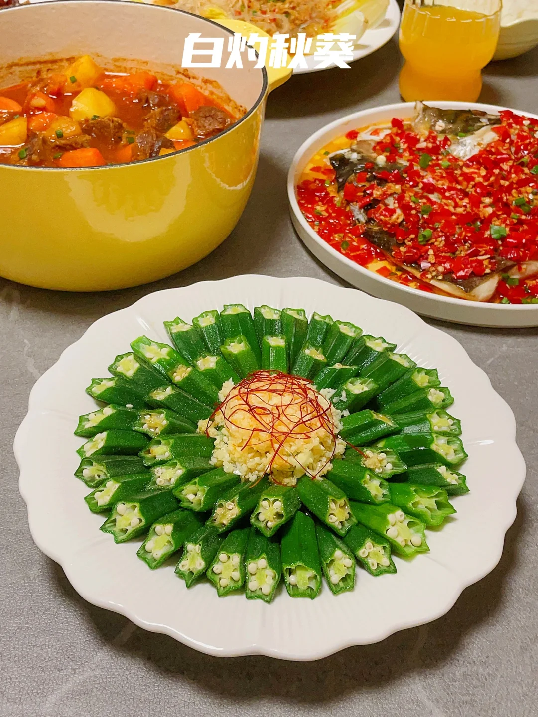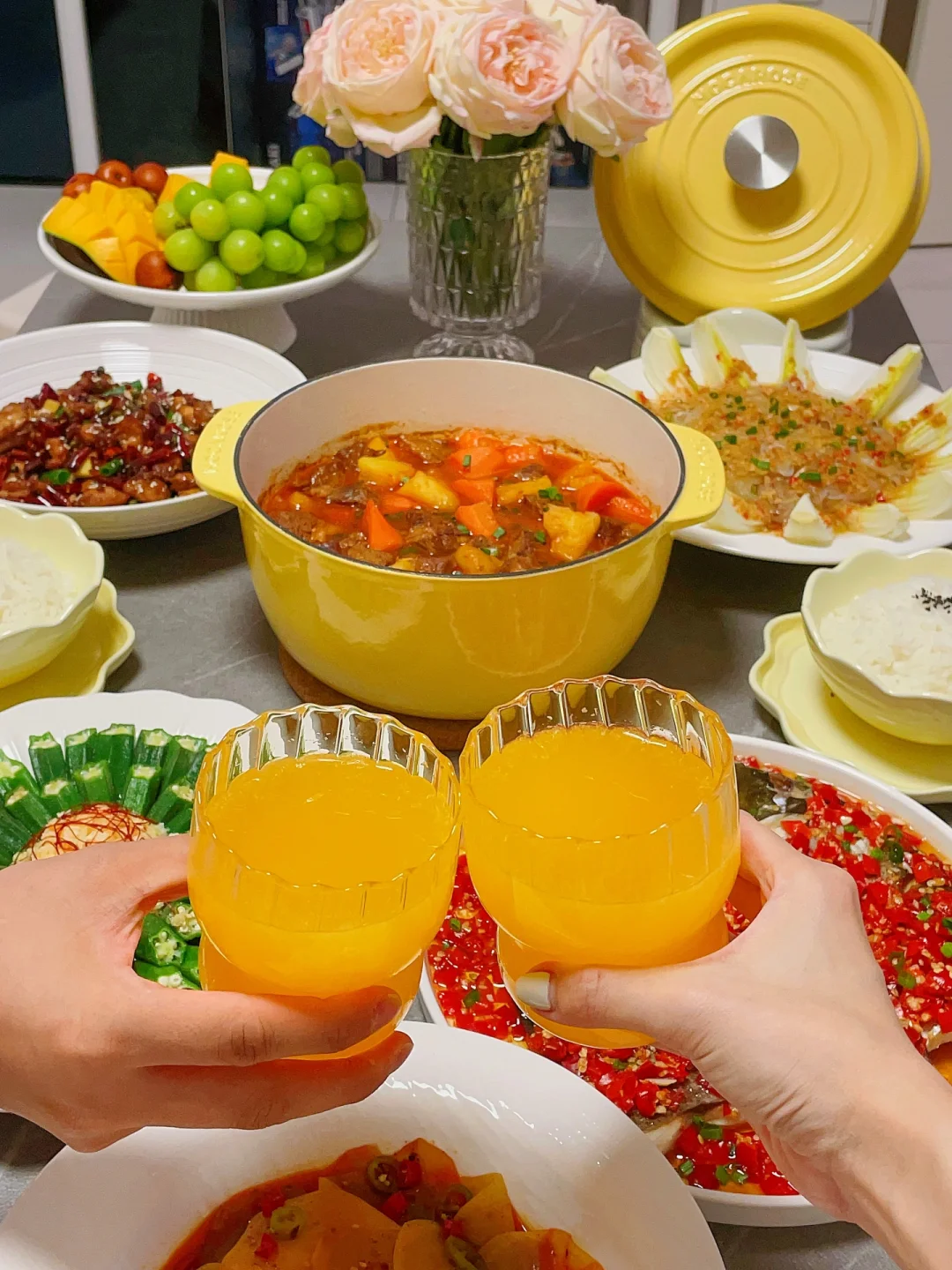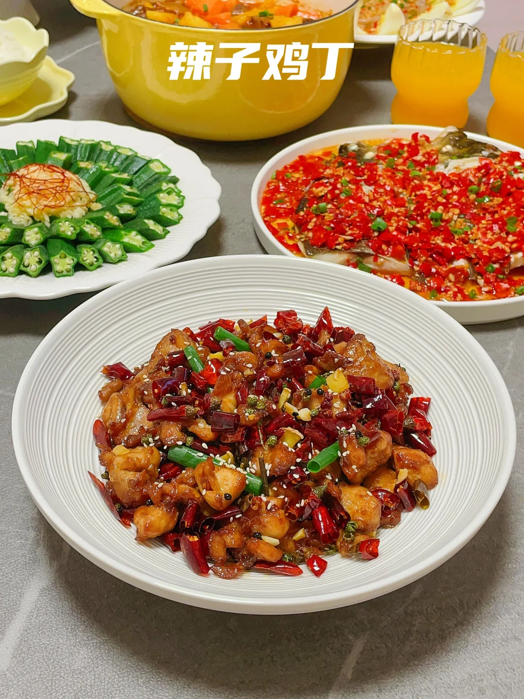 🍅熟透了的番茄拿来炖牛肉味道简直太棒了,用珐琅锅小火慢炖,锁水蓄热好,牛肉软烂入味。剁椒鱼头和辣子鸡也是简单快手的硬菜,下饭又下酒。