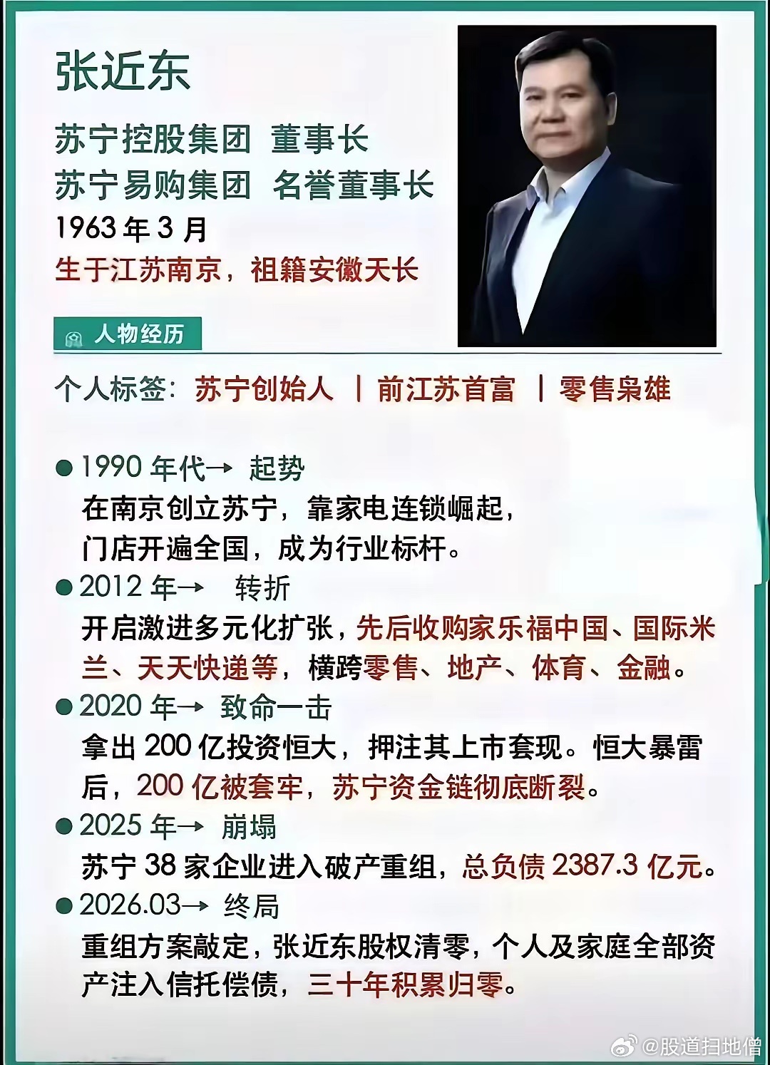曾经的苏宁,可是从街头家电门店发展成覆盖零售、地产等多领域的“商业帝国”。但如今,它陷入了超两千亿的债务困局,严重资不抵债。苏宁系38家公司实质合并重整草案表决期一延再延,资产状况惨不忍睹,账面968亿,评估价637亿,清算价值仅410亿,只能覆盖17%的债务,普通债权清偿率仅3.5%。有人说“成也近东败也近东”,创始人张近东曾带领苏宁走向辉煌,如今面对困局,他以“清零”姿态“断臂求生”,牺牲个人与家族利益,为苏宁争取未来。商业世界残酷,苏宁能否借此重生,只能拭目以待。