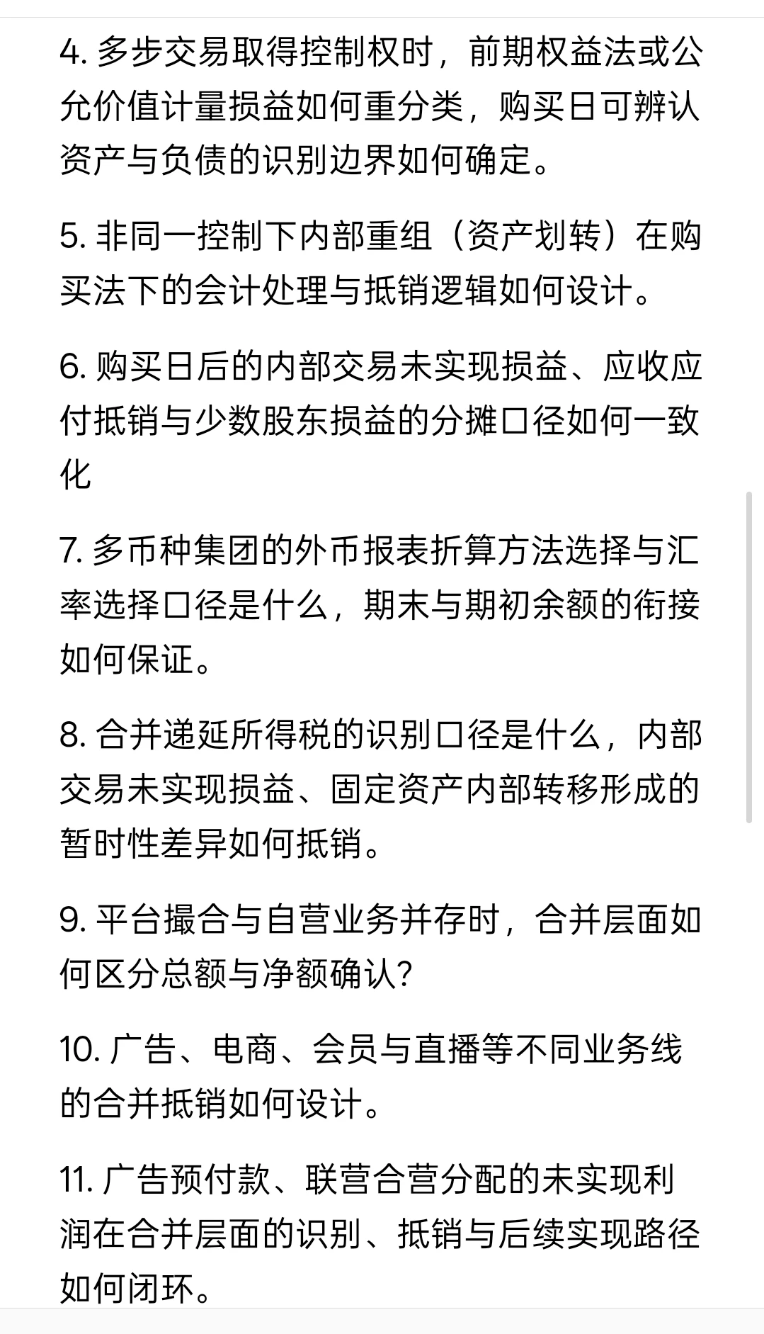 4. 多步交易取得控制权时,前期权益法或公允价值计量损益如何重分类,购买日可辨认资产与负债的识别边界如何确定。