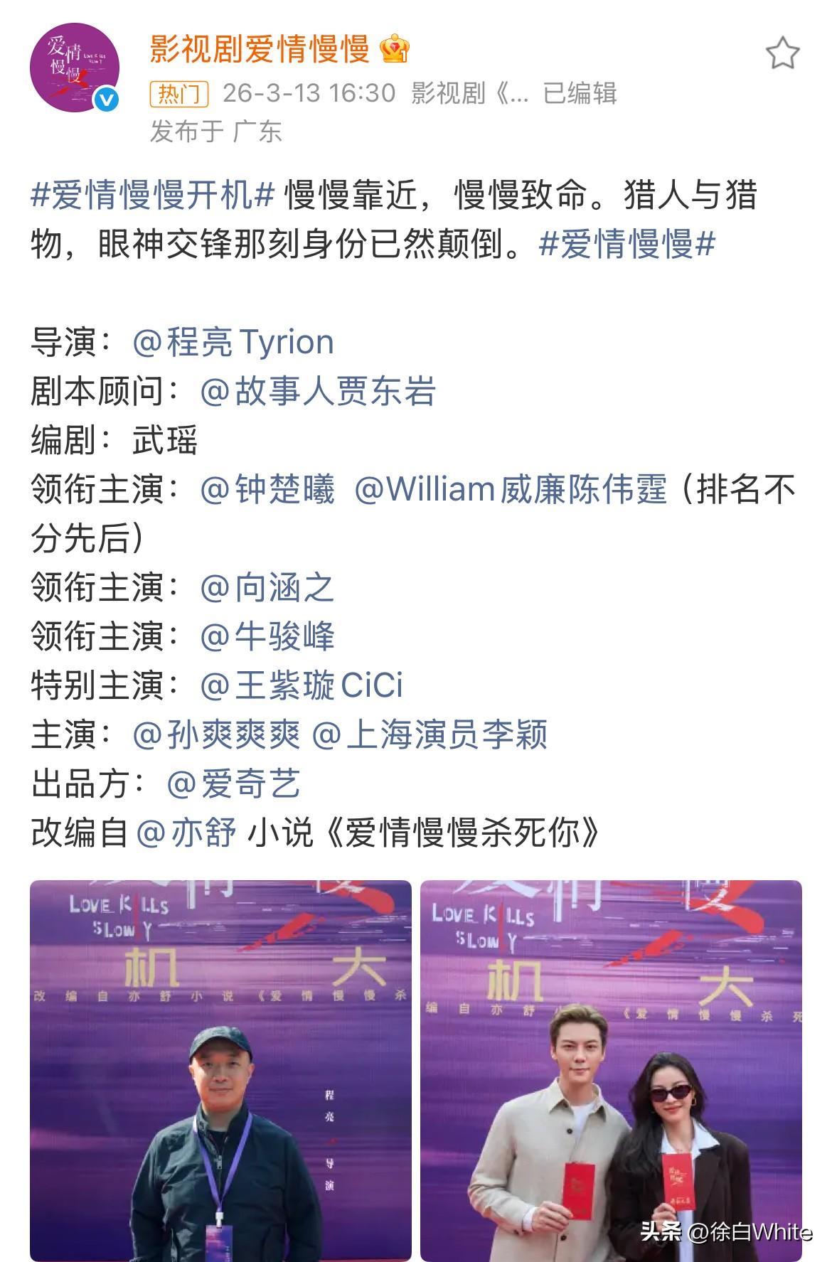 3月14日,陈伟霆继《许我耀眼》后再演都市情感剧,这次搭档的对象是钟楚曦! 令人没想到的是,作为大爆剧男主,这部剧导演在前,钟楚曦平番在前,陈伟霆反而落后于其他人,这也不是按名字笔画拍的序啊,这个导演也不是大家熟悉的导演,拍摄周期3个月,拍摄节奏倒是挺快的! 感觉自从陈伟霆当爸爸后,事业心爆棚,这两年进组频率非常高,基本一年2部剧的节奏,作为剧粉很开心!