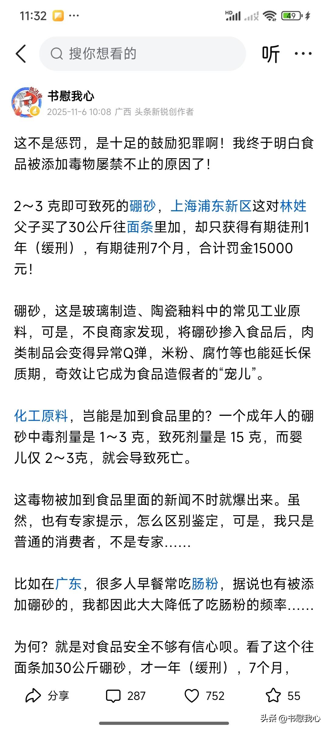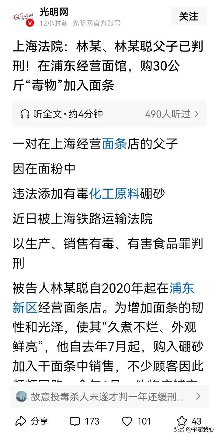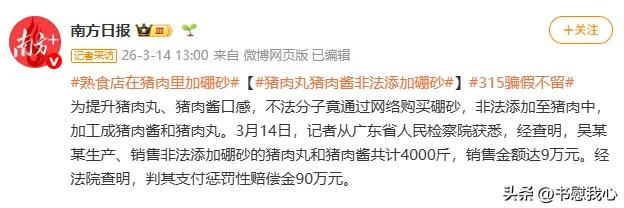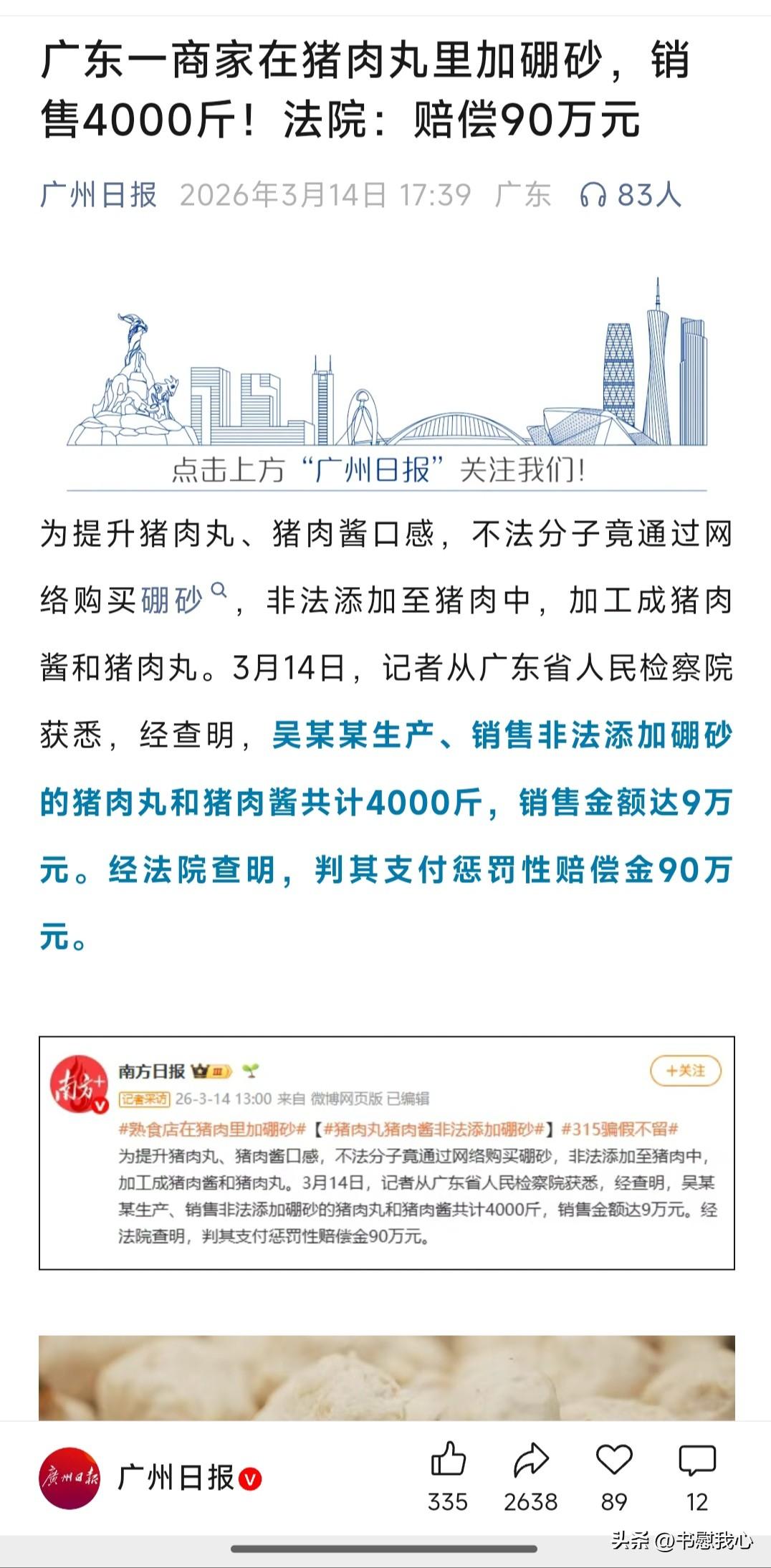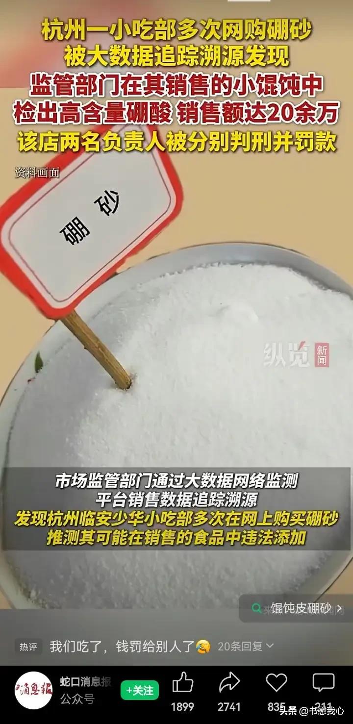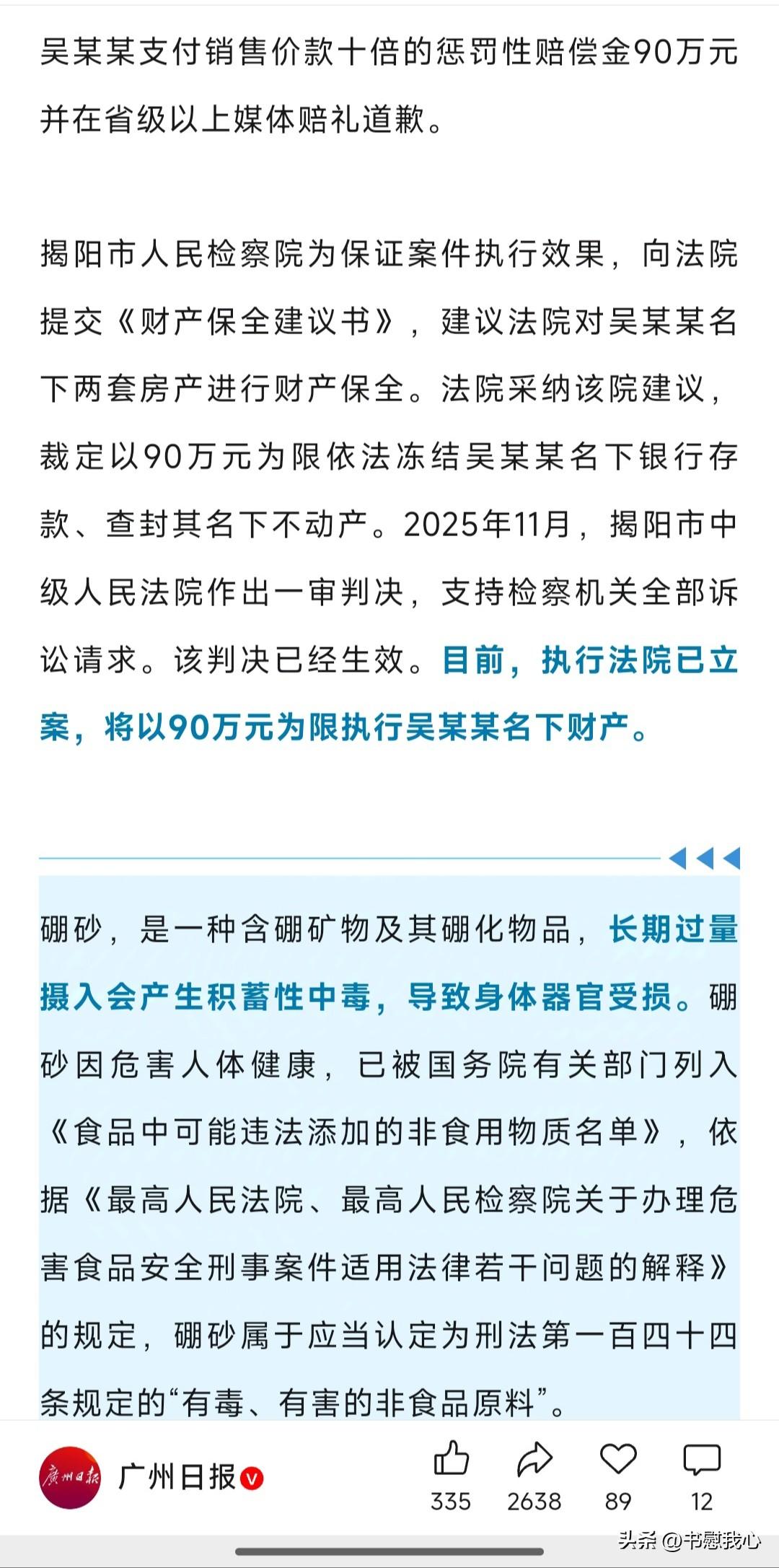 又是有毒致癌的硼砂,这次又是一卖就9万元了,好在,不良商家喜提90万罚款!维护食品安全,还看广东吗?任重道远啊! 原来,广东揭阳的吴某某,在一年的时间里,将买的45斤硼砂,加到自己店里做的猪肉酱和猪肉丸,通过零售、批发等方式向本地多家餐饮店及不特定消费者销售……知道这个消息后,估计当地的人的内心都是坍塌的! 这个不良商家吴某某被认定的生产、销售非法添加硼砂的猪肉丸和猪肉酱4000斤,都进了揭阳人的肚子吧。 然后,吴某某闹出这么大的事情,危害不特定的大批人的身体健康(硼砂的危害,自己看资料,简单说就是有毒致癌,对婴幼儿危害更大),销售金额9万元。如果就罚他个几万元,金额不多,相对于他造成的危害,更是开玩笑的罚款而已。 此次,当地揭阳市人民检察院就根据《食品安全法》相关规定,诉请判令吴某某支付销售价款10倍的惩罚性赔偿金,也就是90万元,检察院还建议法院对吴某某名下两套房产进行财产保全。法院也裁定以90万元为限依法冻结吴某某名下银行存款、查封其名下不动产。 吴某某这个不良商家,卖了9万元的有毒食品,不管他赚了多少,但是,喜提90万元罚款,对他这样的坏人来说,还是可喜可贺的。虽然,相对于已经吃下肚的有毒食品造成的危害,这90万元还是很少的金额,但也是现在的法律能做到的最大金额罚款了吧。 确实,硼砂这种化工用品,是致癌物,长期过量摄入会产生积蓄性中毒,导致身体器官受损,甚至导致死亡,对婴幼儿危害更大。只是,一些经营食品的不法商家,因为把硼砂加入饺子、面条和肉类里,会看着更好,吃着Q腾,就不顾人民群众的生命健康安全,非法添加,简直是丧尽天良的做法…… 在此前的微头条里,我也发过几次类似的案件,有上海的,也有杭州的,对于不法商家的判罚,始终是偏轻的(罚款金额不高,判刑是缓刑的),距离消费者呼唤的“让销售有毒食品的不法商家倾家荡产”判罚还相距甚远,只是,这次广东揭阳的判罚,还是多少加重了不少,也算进步,大快人心吧。 舌尖上的安全,任重道远啊!