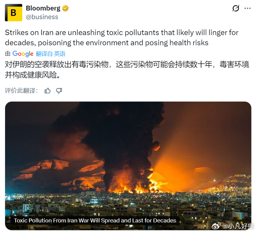 彭博社:对伊朗的空袭释放出有毒污染物,这些污染物可能会持续数十年,毒害环境并构成健康风险。8日,以色列IDF袭击了伊朗最大的炼油厂约 30 个大型储油罐。美国杀害儿童,以色列炸油管一一它们所谓的“为了伊朗人民”。美伊以冲突伊朗总统走上街头伊朗弹道导弹落在以色列市中心画面黄媒不会说的真相