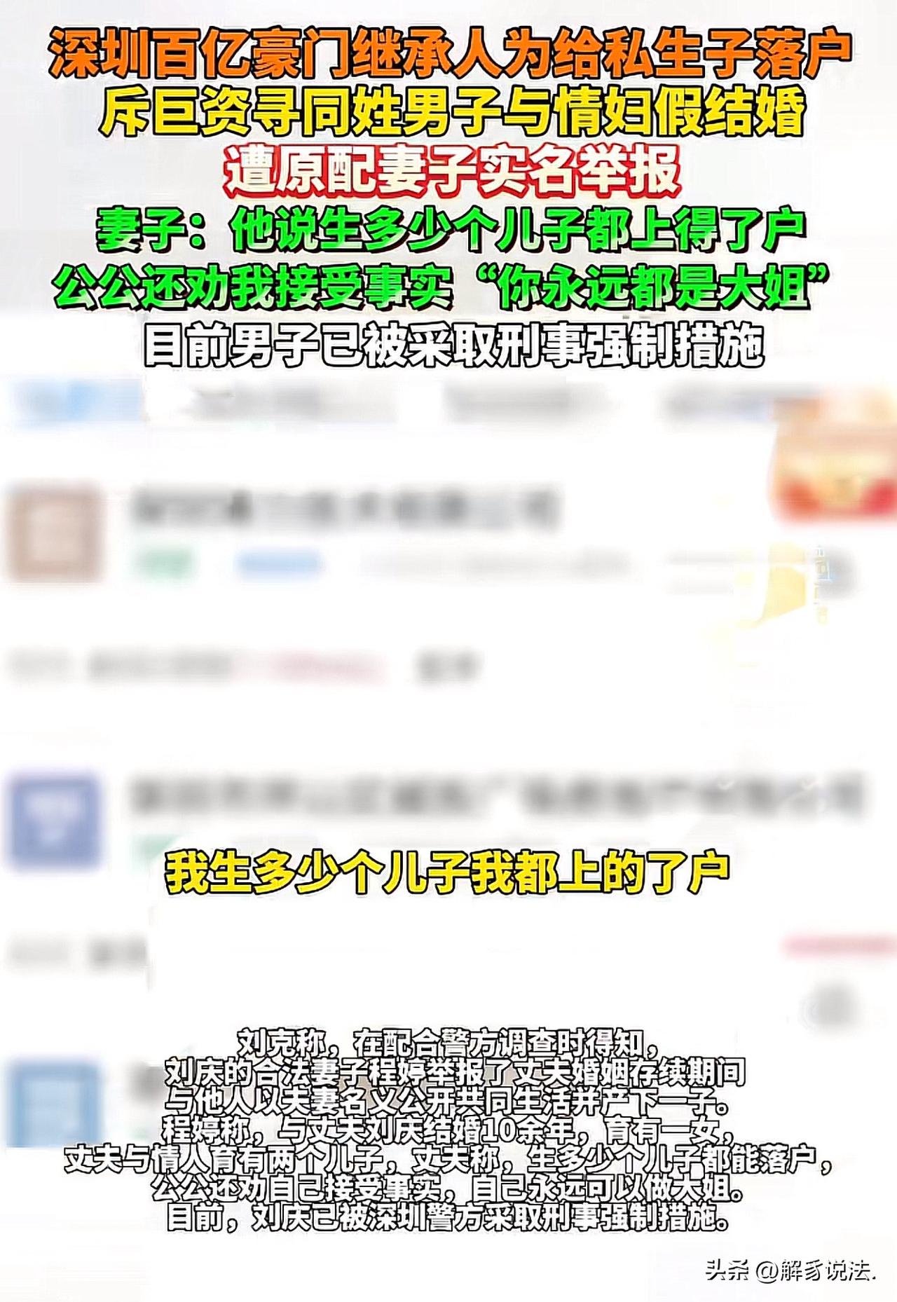 “这个原配是高人!”广东深圳,女子嫁给了某地产大亨的儿子。谁知,对方背着她,在外面金屋藏娇,还和情人生了两个儿子。为了让两个私生子顺利落户,他花了30万元找了个同姓男子与情人假结婚。女子知道后,找丈夫对质,丈夫不知悔改,嚣张的说:我有多少儿子都能为他们落户。女子找公公诉苦,公公却让她睁只眼闭只眼,说她永远是大姐。女子暴怒,接下来仅用一招就将丈夫送进局子里。 27岁的程婷,从19岁就跟了地产富商的儿子刘庆,一路相伴走过了10多年,为刘庆生下一女。 在外人看来,她就是妥妥的人生赢家,嫁入豪门,衣食无忧,日子过得光鲜又让人羡慕。 程婷没有膨胀,努力恪守本分,照顾孩子, 孝顺老人,体贴丈夫。 可她怎么也想不到,自己掏心掏肺付出的10多年里,换来的却是丈夫的无情背叛。 刘庆仗着家里有钱有势,私生活十分混乱,竟然在外面偷偷养了情人,情人还为他生了两个儿子。 期间,为了能让情人和私生子顺利落户深圳,刘庆动起了歪心思,专门花钱找和他同姓的人,精心策划假一场结婚的闹剧。 他找到欠了一屁股外债、急需用钱的刘克,以高额报酬为条件,让刘克和自己的情人登记结婚,等孩子户口落下再离婚。 短短两年时间,这场荒唐的假结婚顺利完成,刘克也拿到了30万的好处费。 刘庆则自以为做得天衣无缝,丝毫没有把妻子程婷放在眼里。 甚至敲锣打鼓的为私生子办生日宴,还公然和情人以夫妻名义出席,场面十分高调,有看不下眼去的人偷偷录了拍了照。 一直蒙在鼓里的程婷看到这些照片后,只觉得天都塌了,10年的感情和付出,瞬间变得一文不值。 她忍着心痛找刘庆对质,本想让丈夫认错悔改,可刘庆非但没有一丝愧疚,反而态度嚣张、理直气壮,觉得自己有钱就能为所欲为。 甚至还大放厥词:我有多少个儿子,我都能为他们落户。 更让程婷心寒到底的是公公的态度。 公公得知儿子的所作所为后,不仅没有指责儿子,为儿媳妇主持公道。 反而劝说程婷,让她接受这个事实,还说:你永远是大姐。 意思让程婷睁只眼闭只眼,默许丈夫的背叛。 程婷被公公的话彻底激怒,这样的日子一天她也过不下去了,这样的婚姻不要也罢。 她绝不能就这么忍气吞声下去,决定为自己讨回公道。 程婷开始暗中寻找证据,她找到了当初参与假结婚的刘克。 刘克得知程婷的遭遇后,内心十分愧疚,觉得自己当初为了钱做错了事,于是答应配合程婷,一起出面指证刘庆的重婚行为。 拿到确凿证据后,程婷不顾婆家的阻拦,毅然选择报警。 刘庆见事情败露,吓得仓皇出逃,躲到了国外。 但法网恢恢疏而不漏,在警方的努力下,潜逃在外的刘庆最终被劝返回国。 如今,刘庆已被警方采取刑事强制措施,取保候审,而参与假结婚的刘克也被警方依法传唤。 《刑法》第258条规定:有配偶而重婚的,或者明知他人有配偶而与之结婚的,处二年以下有期徒刑或者拘役。 刘庆在与程婷婚姻关系存续期间,与情人以夫妻名义共同生活并生育子女,同时策划假结婚为私生子落户,其行为已符合重婚罪的构成要件,等待刘庆的是法律的追责。 此外,刘庆与刘克合谋的“假结婚”落户行为,还涉嫌违反《户口登记条例》,通过虚构婚姻关系骗取户口登记,属于扰乱户籍管理秩序的违法行为,相关责任人将面临行政处罚,情节严重的还可能涉及伪造国家机关证件类犯罪。 此事曝光后,网友纷纷为原配出谋划策: 闹开了闹大了然后男方为过错方可以多给原配分财产,至少一人一半吧?然后别要孩子,把孩子给男方,以后孩子和私生子们一起在分男人剩下的一半一半财产,原配孩子的总财产可以达到男人拥有的绝大部分。要是不闹开以后男人会把财产分给原配孩子私生子最多一半,如果原配生的女孩估计一小半都得不到。所以原配闹是对的。 作为合法妻子,闹开了,才能光明正大的离婚,一旦离婚,好歹不分几个亿的财产。还不用继续受夫家霸凌,自由自在。 《民法典》第1087条,离婚分割共同财产时,应照顾子女、女方和无过错方权益;第1091条明确,实施家暴、有其他重大过错导致离婚的,无过错方有权请求损害赔偿。 网友说的对,程婷可以向法院起诉离婚,基于丈夫犯重婚罪的事实,是过错方,陈婷可以主张多分财产,争取利益最大化。