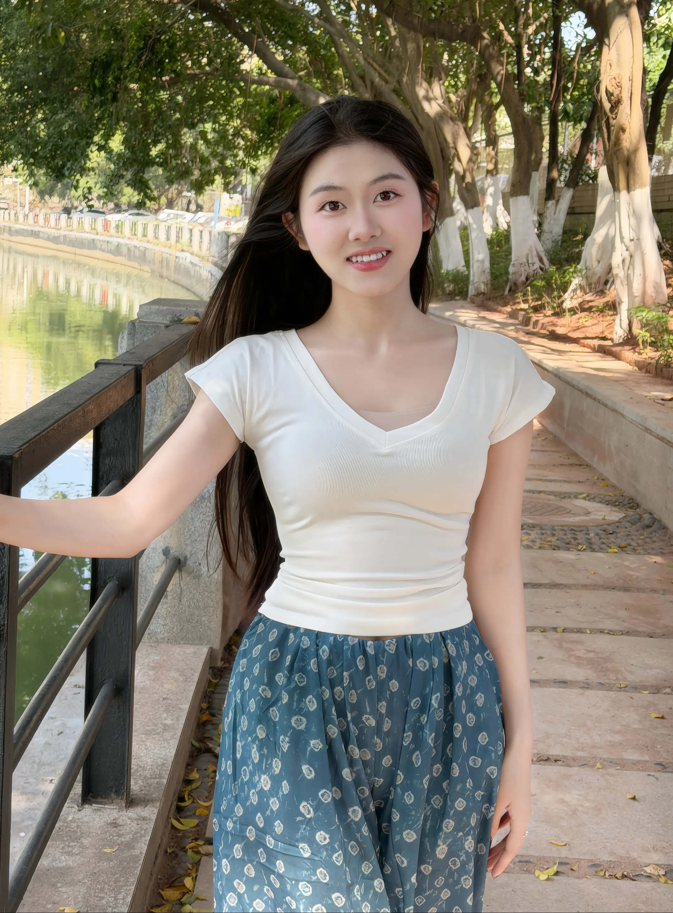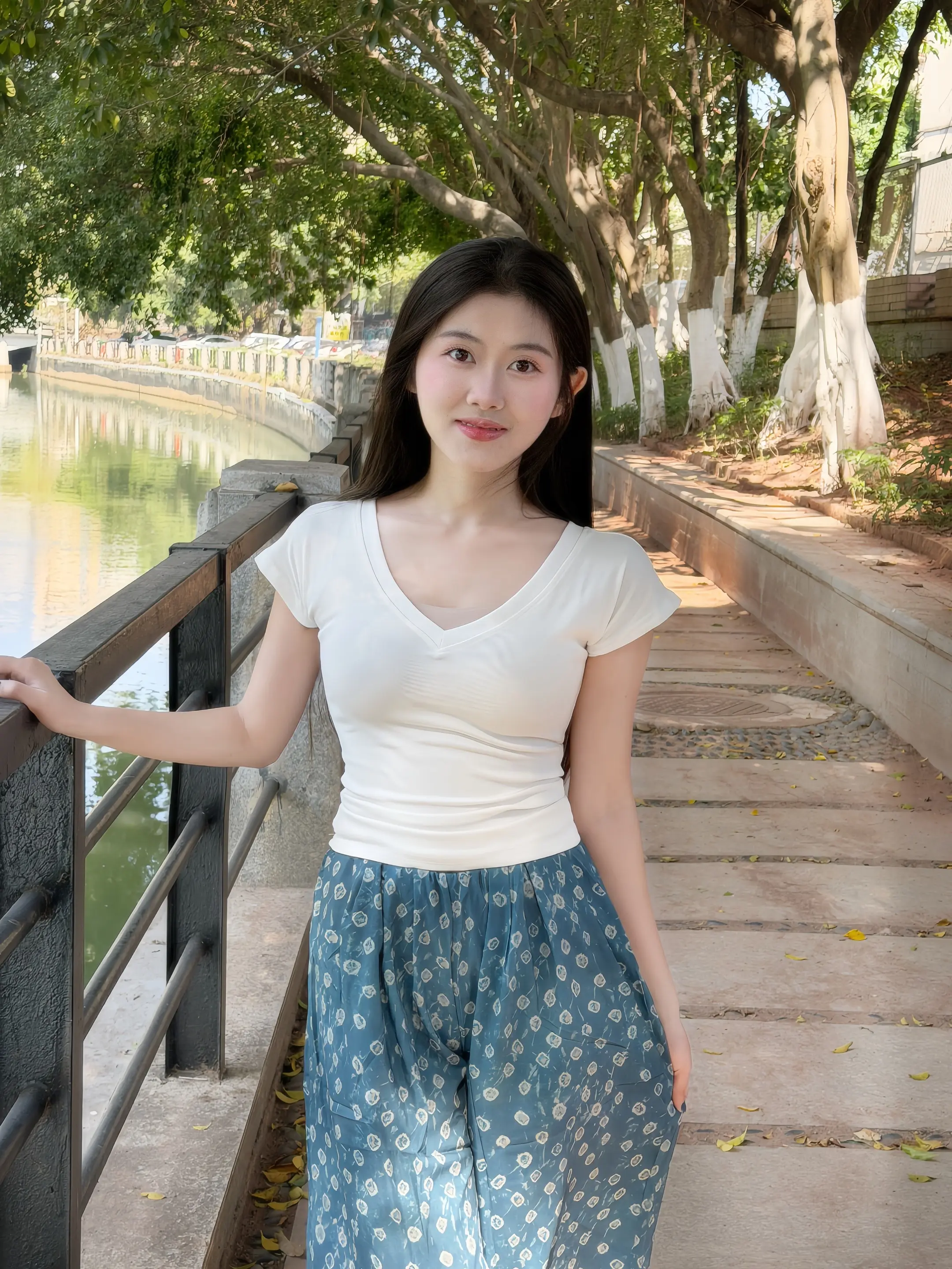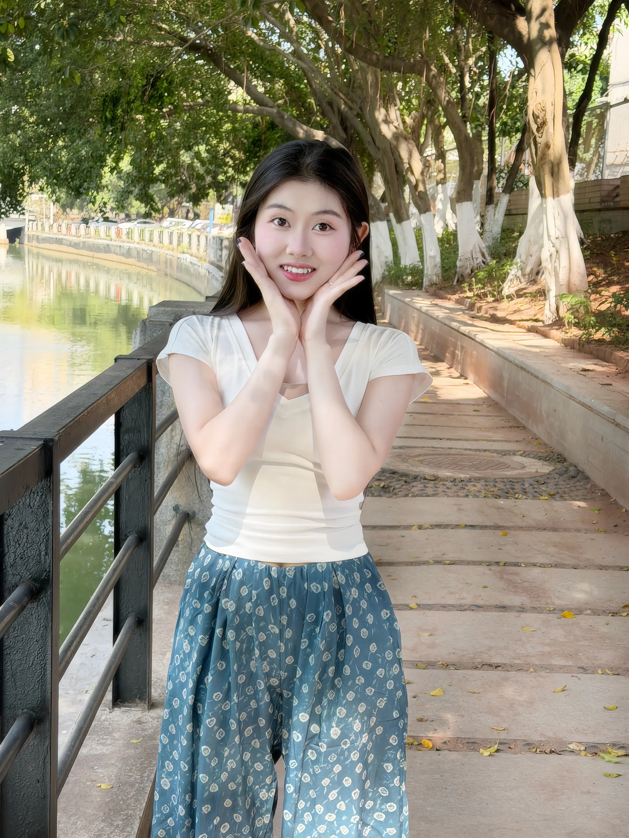 春天 阳光下 小河 大树 我