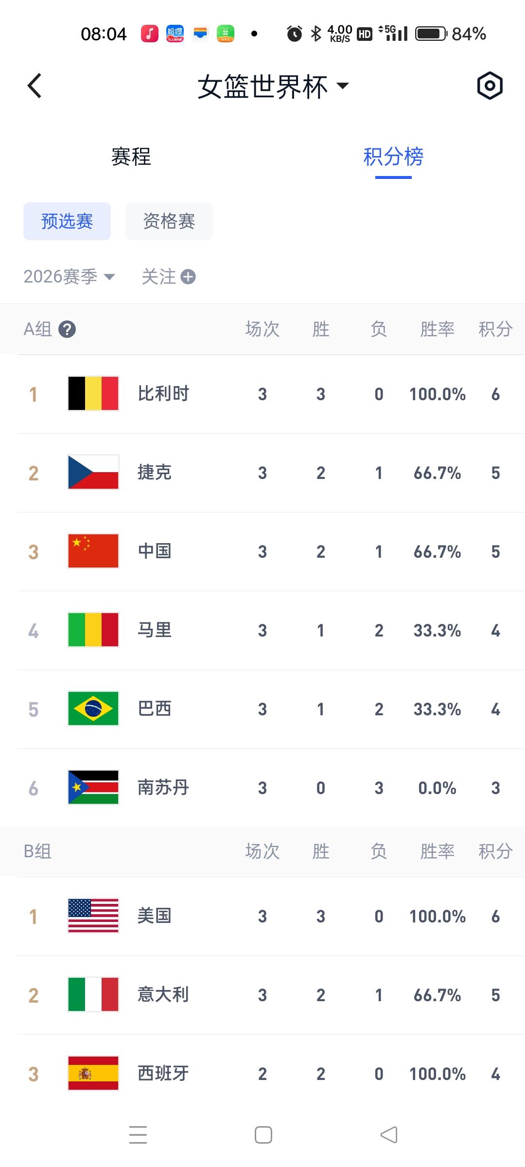 2026女篮世界杯预选赛最新排名,经历了3场比赛过后,B组和D组晋级球队基本确定