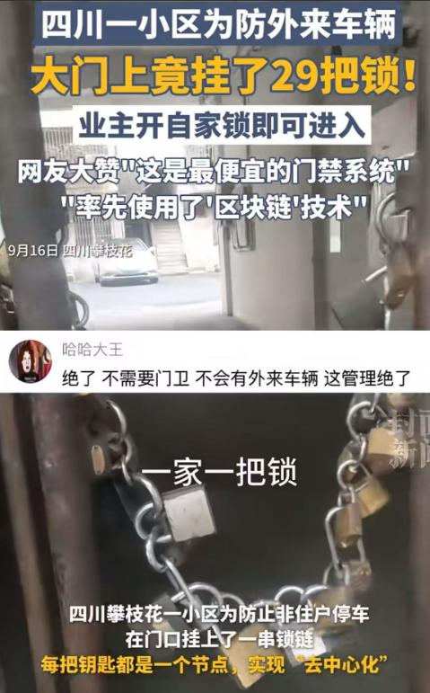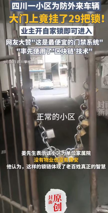 “人怎么可以聪明到这个样子?”四川攀枝花,一小区为了防止外来车辆进入,竟然在小区入户门上挂了29把锁,业主开自家锁即可进入。网友:“这虽然是最便宜的门禁系统,但却使用了超前的“区块链”技术!” - (阅读前请点个赞,点个关注,主页有更多你喜欢看的内容) - 攀枝花有个小区最近突然火了,原因挺奇葩——大门上挂了整整29把锁,红色、蓝色、绿色五颜六色排成一排,每把锁还贴着编号,业主回家必须先找到自己那把锁,把钥匙插进去捅开,门才能推得动,别人家的锁根本不用管,各自管理,各自安全,网友看了都乐疯了,称这是“地表最寒碜门禁”,也是“最硬核区块链”,听起来像段子,但背后其实是一套被生活逼出来的生存哲学。 以前小区乱成什么样?外来车辆随便插队,车位一片混乱,业主天天为停车问题吵架,物业也不是没尝试过解决办法,电子门禁装过,保安也派过,可每次都三天两头罢工,系统识别不出人,或者卡丢了进不去,业主怨声载道,问题就是物业兜里没钱,动辄几万块的刷脸设备根本负担不起,最后物业一咬牙,用了这个土办法,每户挂一把锁,自管自管,成本低得可怜,几十块钱的锁头就解决了多年老大难问题。 这套系统其实运作简单得很,你是业主,只要拿钥匙开自家那把锁就行,其他28把锁跟你没关系,外人想进?抱歉,29道关卡摆在那儿,一把都过不去,物业贴心地给每把锁编号、分颜色,防止业主找不到,主管张经理笑着说这是“宾至如归”,起初业主也嫌丑,一楼王大姐直摇头说门口挂得像菜市场,每次还得对号入座,脑壳痛,可用了一阵子,她态度变了,说外来车真的绝迹了,孩子在院子里跑她也心安了。 李先生也觉得是如此,早上上班得多花几十秒找钥匙孔,可比起以前车堵得动弹不得,这点仪式感根本不算什么,网友们把这事儿玩出了花,有人画出《攀枝花大门解锁秘籍路线图》,有人说“史上最赛博朋克门禁”,还有人上升到理论高度,说29把锁就是29个独立节点,每户都是矿工,不就是去中心化吗,逻辑听起来玄乎,但站得住脚,每把锁都是独立权限点,每户自己管自己的锁,互不干扰,没有统一中控,哪怕一把坏了也不会影响别人,邻居照样能顺利回家,整个小区不会因为系统出问题而全体受阻。 当然,这套系统也不是完美无缺,最致命的问题是万一来了救护车、消防车怎么办,29把锁一把一把开,耗时可想而知,物业也承认这个隐患,并表示正在研究加强版方案,可话又说回来,在预算有限、传统手段全军覆没的情况下,这已经是他们能想到的最优解了,最好的办法不一定是最高级的,这29把锁没有芯片,没有算法,却踏踏实实解决了困扰大家多年的问题,这也告诉我们一个简单的道理,只要能解决问题,土办法也是好办法,解决眼前难题,比什么高科技都实在。