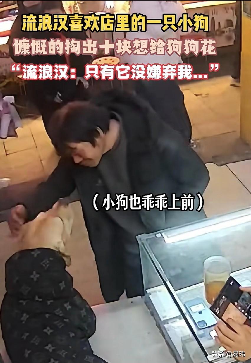 泪目了!一位小哥哥开了一家手机店,这天他和往常一样在守店。而他养的金毛狗狗则蹲在店里休息,这时一位有些狼狈的流浪汉走了进来。只见他温柔地对着狗狗说我可以摸你吗?你不要叫噢! 狗狗似乎听懂了他的话,也是乖乖上前让他摸,而且也没有凶他,流浪汉很感动很开心,于是掏出十元钱递给小哥哥,而小哥哥拒绝了道,摸狗狗不要钱。而流浪汉则说,我知道不要钱,只有它不嫌弃我,我要给它买吃的。 小哥哥听了也是很感动和同情这个男人!这满是心酸的一句话!只有它不嫌弃我,一只狗狗不嫌弃!最终流浪汉抱了抱狗狗就离去了!