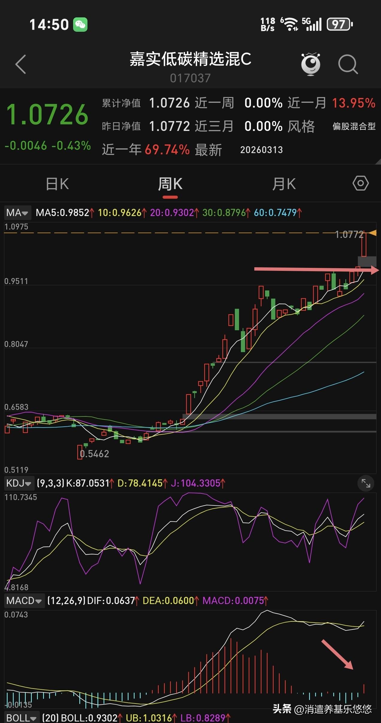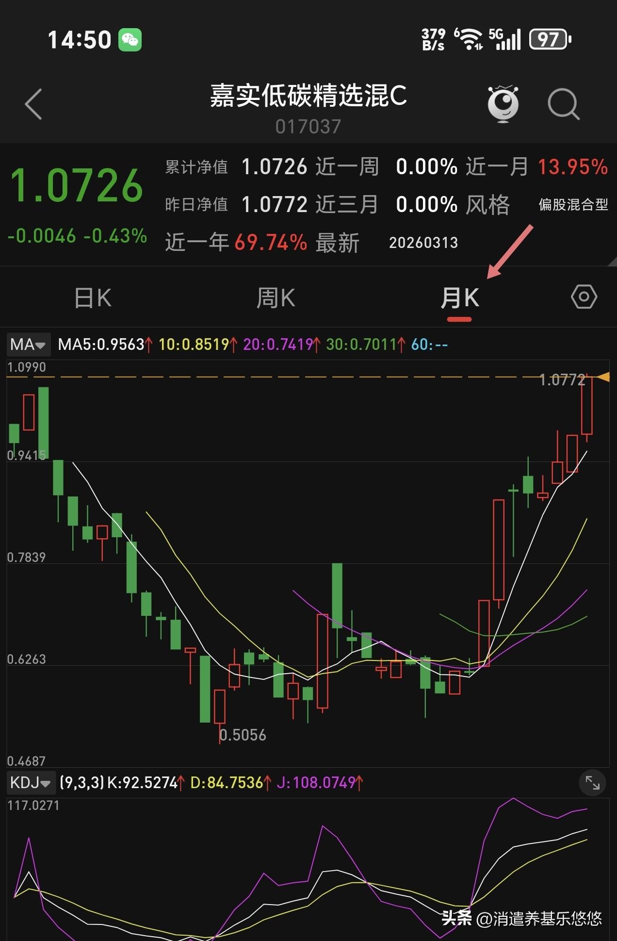 这个储能基金嘉实低碳精选混合何时可以买入?它近一个星期涨7.96%,近一个月涨13.95%,近三个月涨19.35%,近6个月涨40.5%。业绩在同类型板块基金里面全是比较靠前的。持有股票是有电池,光伏,风电组合的头部企业股票。日线周线月线都是突破了前期压力位,各条均线都是向上发散,明显多头趋势。接下来就是等它回调,下周初看能不能回调5日线支撑,是个介入点,然后是回调10日线支撑 ,短线难实现,因为回撤有点大。 个人观点仅供参考,不构成投资依据。点赞转发评论关注,投资理财不迷路。