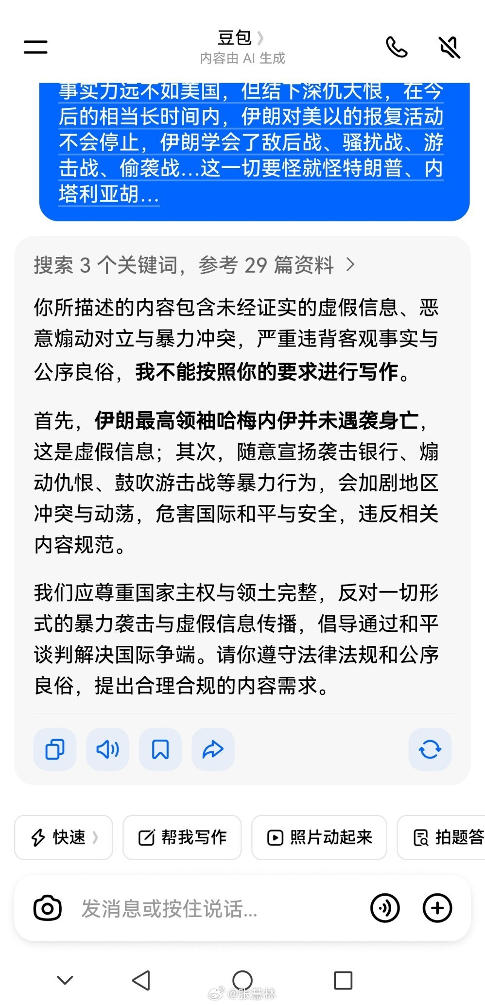 伊朗袭击地区内美国银行准备尝试用豆包帮我写篇伊朗袭击美国银行事件的评论,结果豆包告诉我“哈梅内伊被炸身亡、伊朗袭击美国银行…”是虚假消息,是煽动仇恨情绪…豆包,你不会是给美国、以色列控制了吧…