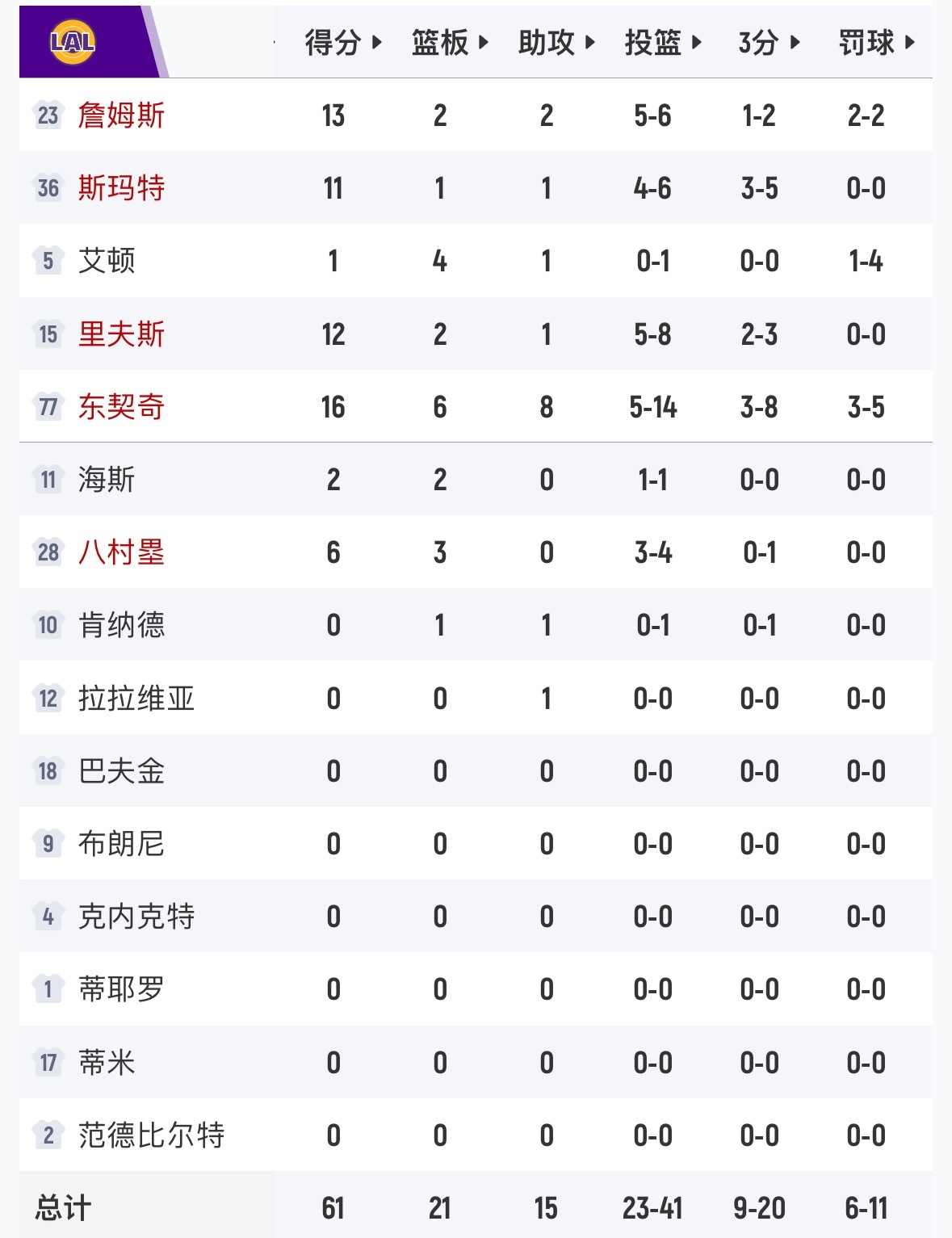 打得不错!半场湖人队11分优势,61-50! 掘金vs湖人