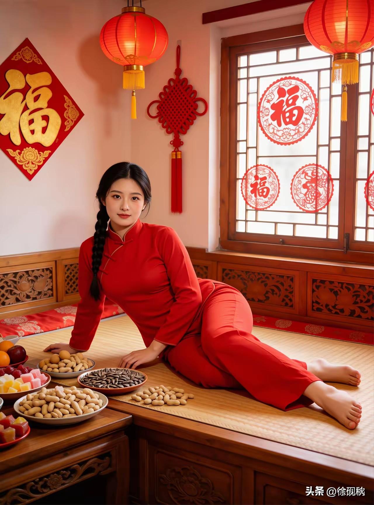 靓女妩媚笑容甜, 红裙吊带挂香肩。 无钱无势空才子, 有钱有权续姻缘。