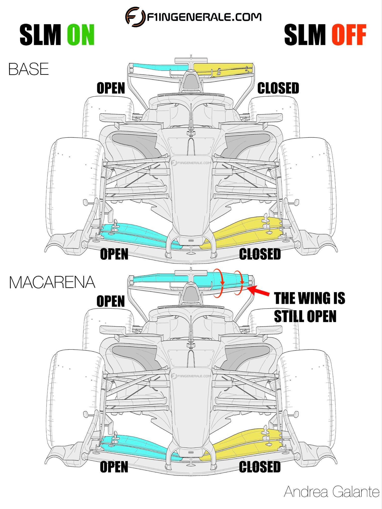 为什么法拉利临时拆掉了“玛卡雷娜”尾翼?核心问题出在刹车时前后襟翼闭合的同步性不一致。后襟翼需要转动的角度大得多,当前襟翼已经闭合时,后襟翼还在转动,这就造成了前后轴的空气动力学不平衡,导致车尾过度失载、车身不稳定。