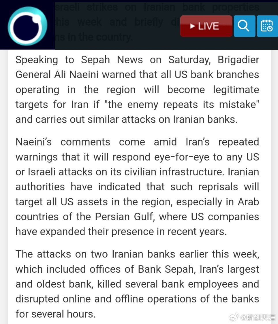 周六,少将阿里·纳伊尼在接受“塞帕”新闻频道采访时表示,如果“敌人重蹈覆辙”,对伊朗银行实施类似袭击,那么该地区所有运营中的美国银行分支机构都将成为伊朗的合法打击目标。