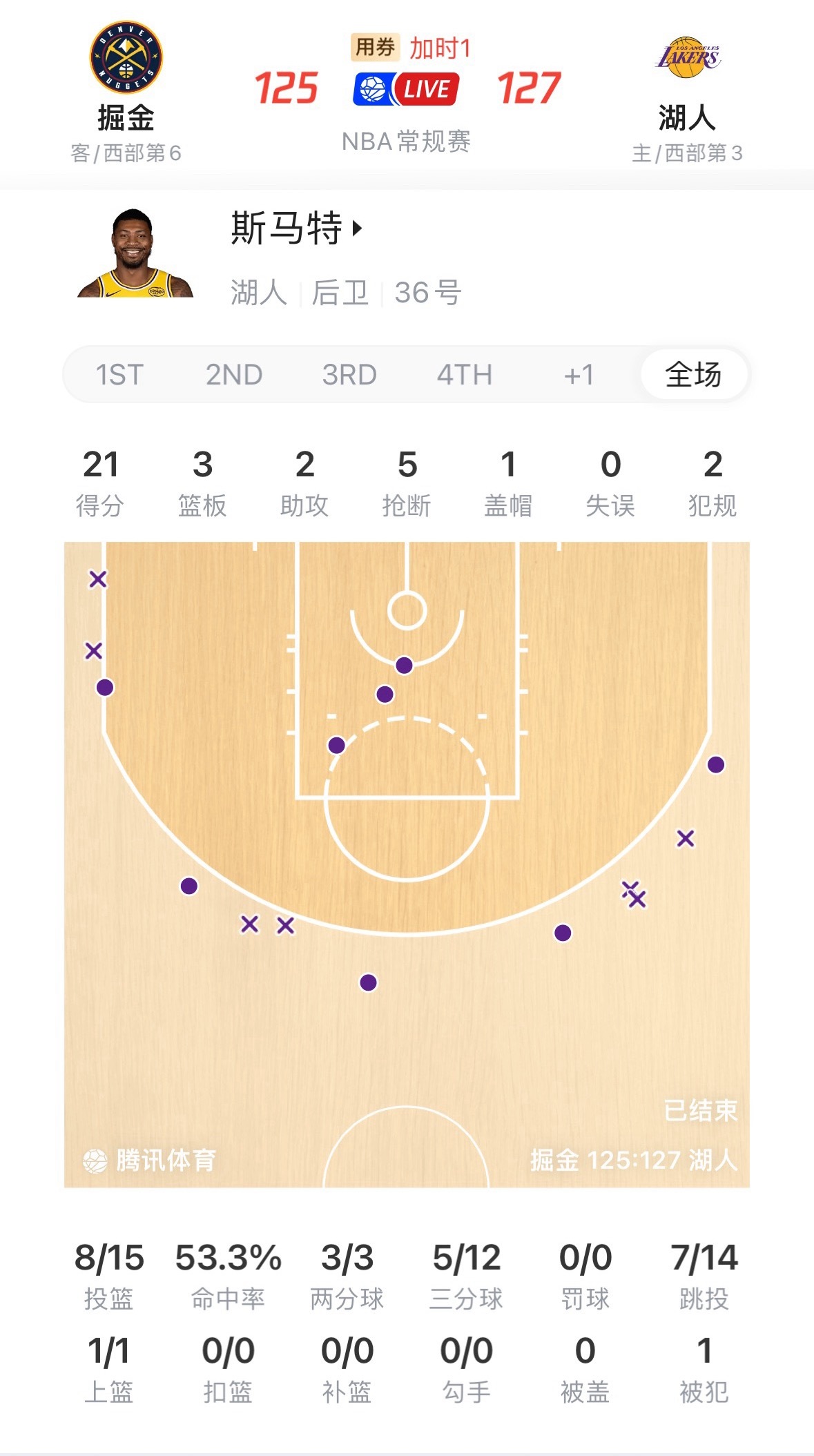 主将不用夸了,角色球员斯玛特!也是神!21分3板2助攻5抢断1盖帽0失误!掘金vs湖人