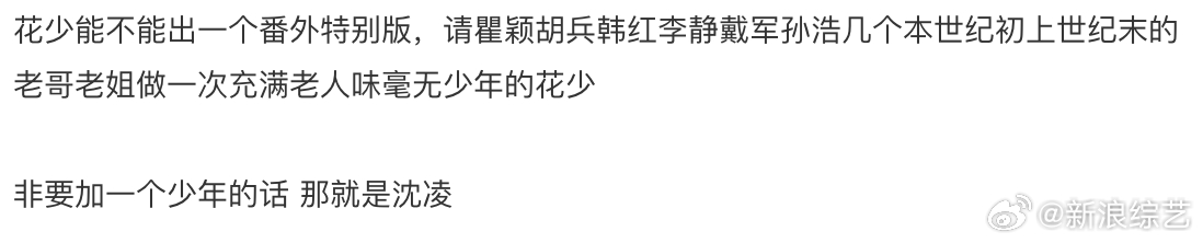 花少 花儿与中老年怎么说还得是网友会想呢!近期瞿颖的一段视频引发了网友对中老年一代艺人综艺感的热议,提名花儿与少年邀请瞿颖、胡兵、李静、戴军、孙浩等资深艺人组团,这些曾活跃于上世纪90年代至本世纪初的明星因多年友情自带默契。如果非要带一个年轻的少年的话,那可以将沈凌加入。已经不敢想象下一季花少要是真把这些人组一起了,会有多好看!
