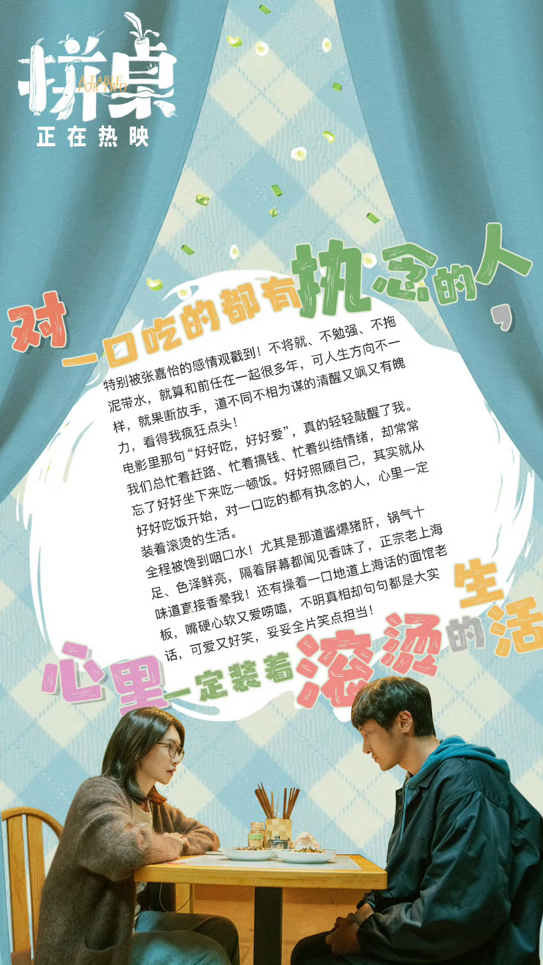 这大概就是这部电影的魔力看完更想要好好吃一顿饭了!因为对味的饭、对味的人真的很重要...会遇到数不尽的问题或许就是必然的酸甜苦辣,离别、误会、寻找,还是想告诉所有人片尾那幅挂字,简单但是好有力量,请所有人:“好好吃,好好过,好好爱。”生活以痛吻我,我将报之酱爆猪肝葱油拌面~🍜