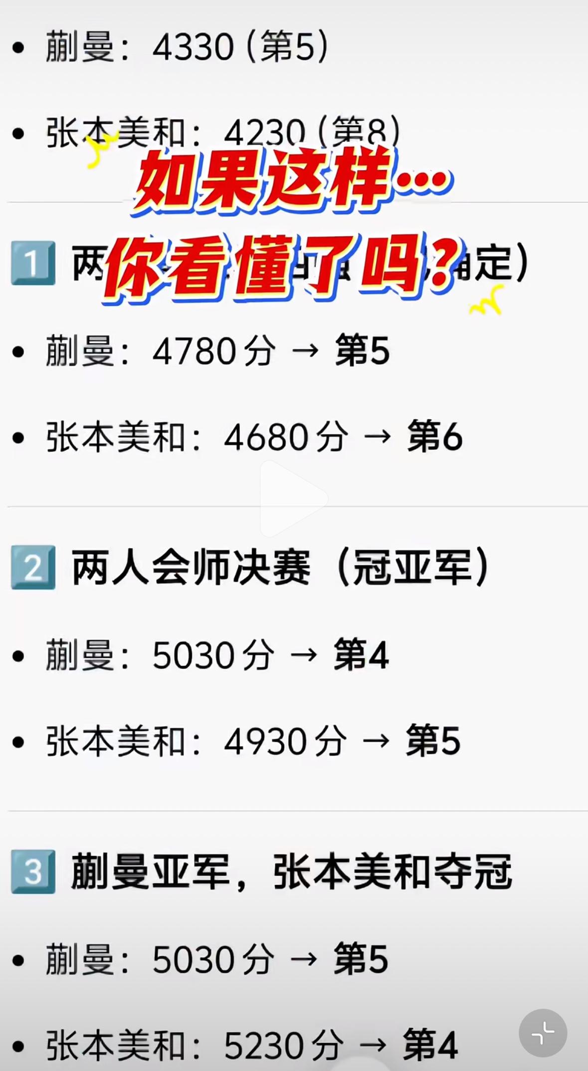 张本美和4:1大藤沙月晋级决赛 赛后采访:离自己的目标越来越近啦! 3月15日,重庆冠军赛,女单半决赛中,张本美和4:1大藤沙月,晋级决赛,赛后采访中,张本美和表示: “这次的重庆冠军赛,目标就是 夺冠🏆,因为自己还没有拿到过 冠军赛的冠军🏆, 能晋级决赛, 离自己的目标越来越近啦! 而且我在2026年的大目标就是 进入世界前五, 或再往前一步, 如果我在决赛中夺冠, 我的目标就都可以实现!” 张本美和如果夺冠,积分为5230, 世界排名来到第四, 如果蒯曼夺冠, 蒯曼将成为世界第四! 所以这个第四大种子位, 蒯曼势在必得,加油蒯曼!