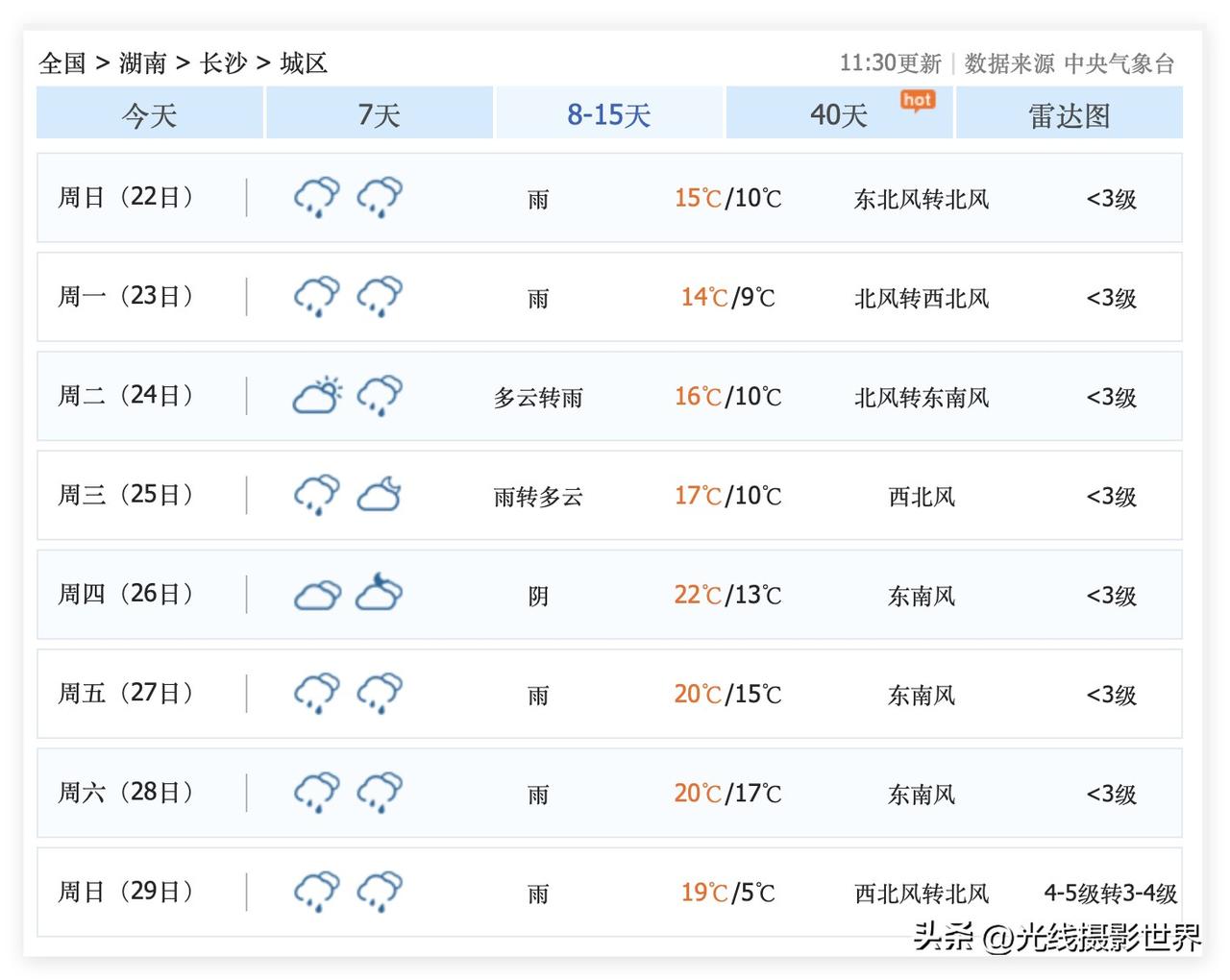 哎呀!3月15日,湖南省长沙市,气温大跳水,一夜入冬……而且,中央气象台最新天气预报显示,3月16日到23日,长沙市,每天都要下雨,气温低迷……长沙的小伙伴们,赶紧退掉去武汉、杭州、贵阳的火车票吧,这周末,贵阳平坝农场樱花遭遇灭顶之灾,这周末,下周,杭州,武汉,天气都不好…… 3月15日,星期天,长沙小雨,气温8-11度。 3月16日,星期一,长沙小雨,气温9-11度。 …… 湿冷的魔法攻击又回来了,羽绒服,秋衣秋裤……哎呀! 今天,超强冷空气席卷长江流域,长三角,杭州,南京……武汉,长沙……重庆……全部大降温……贵阳今晚好冷啊! 接下来,至少,下周,长江流域的天气,普遍都不好,可是,这正是长江中下游的赏花旺季…… 下周末,目前的天气预报给出的趋势,也很不容乐观! 2026年春季……赏花旺季……