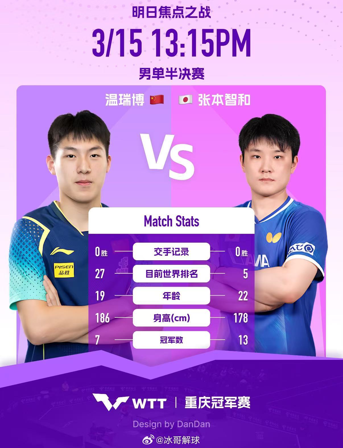 温瑞博vs张本智和WTT重庆冠军赛男单半决赛,温瑞博迎战张本智和。小将敢打敢拼,