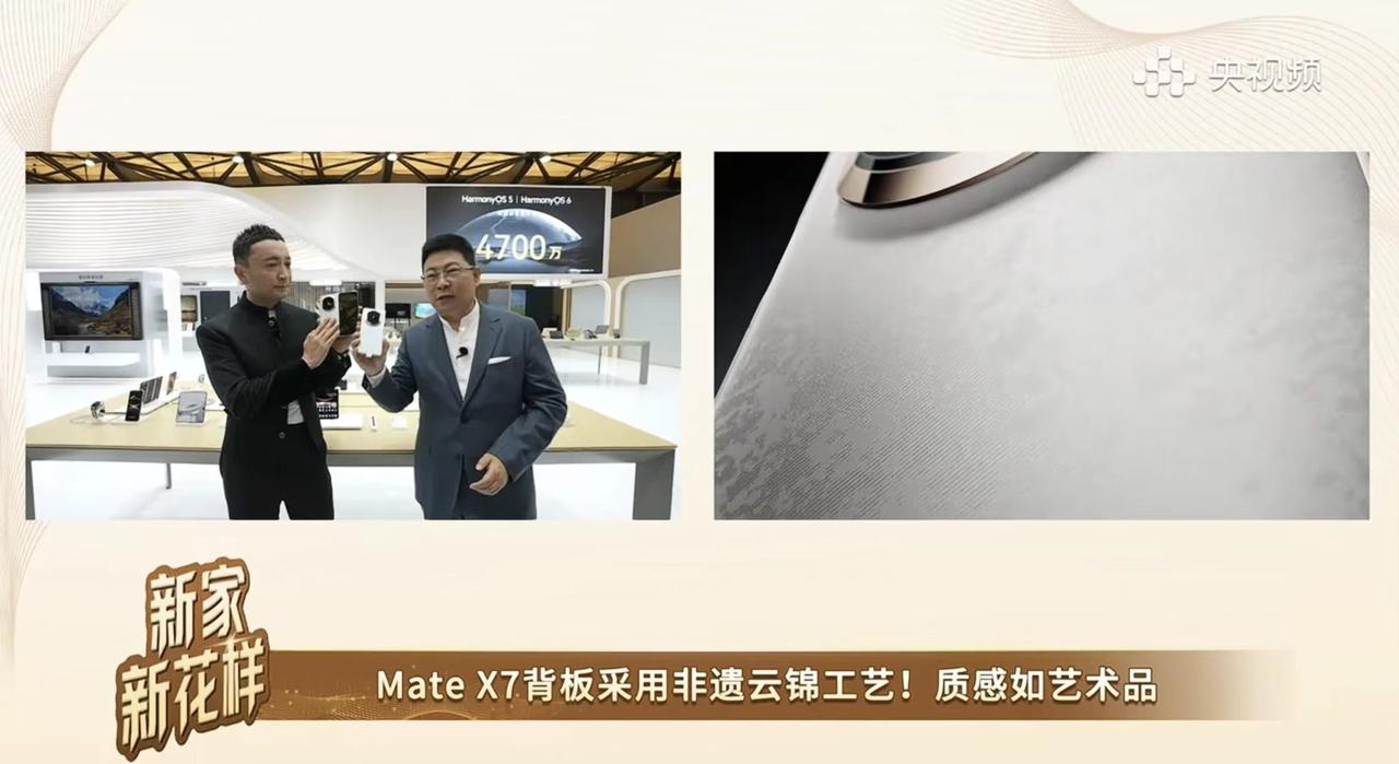 上海AWE展会现场看点不断,余承东手持华为Mate X7,亲自向尼格买提展示机身细节,当镜头聚焦到“时空之门”镜头模组的特写画面时,瞬间俘获全场观众的心,简约高级的设计直接让人一眼圈粉。 起初很多人只是粗略扫过外观,没深究背后的设计巧思,直到听尼格买提夸赞这款设计充满未来科技感,凑近细看才发现暗藏玄机。华为摒弃了市面上杂乱无章的镜头排列方式,采用一体化成型的模组设计,线条流畅利落、轮廓简洁大气,在千篇一律的手机背面设计中,辨识度直接拉满,彻底告别“撞脸”尴尬,拿在手里就是独一份的时尚。 紧接着余承东展示了质感拉满的云锦白配色,揭秘背板暗藏的黑科技:融入非遗云锦古法工艺,以900根经线搭配1700根纬线精密编织,复刻出细腻逼真的立体纹理,绝非普通印刷花纹能比拟。要知道云锦作为传承千年的高端非遗工艺,古时多用于皇家龙袍织造,如今跨界融入手机背板打造,堪称手机行业的首创之举。 这款华为Mate X7完美平衡了硬核科技与传统美学,既有前沿数码产品的质感,又承载着非遗文化的美好寓意,不管是买来自用彰显品味,还是当作礼品馈赠亲友,都显得格外有格调、拿得出手,妥妥的折叠屏优选。