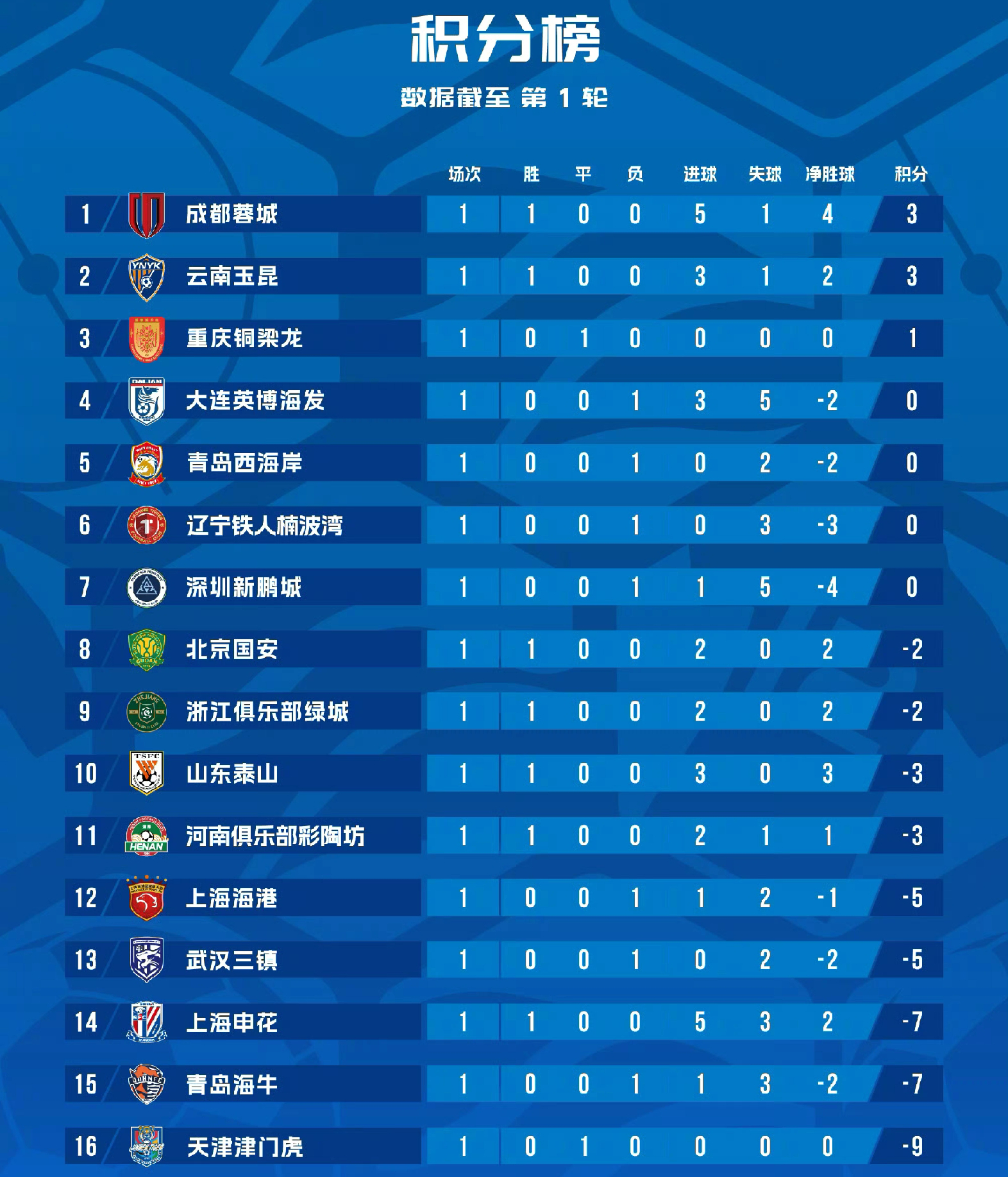 2. 北京国安:本就以-5分开局,本轮又输给直接竞争对手山东泰山,积分依旧停留在-2分,未能实现转正。对于“永远争第一”的国安来说,这样的开局无疑是沉重打击,想要重返争冠行列,必须在接下来的比赛中全力抢分。