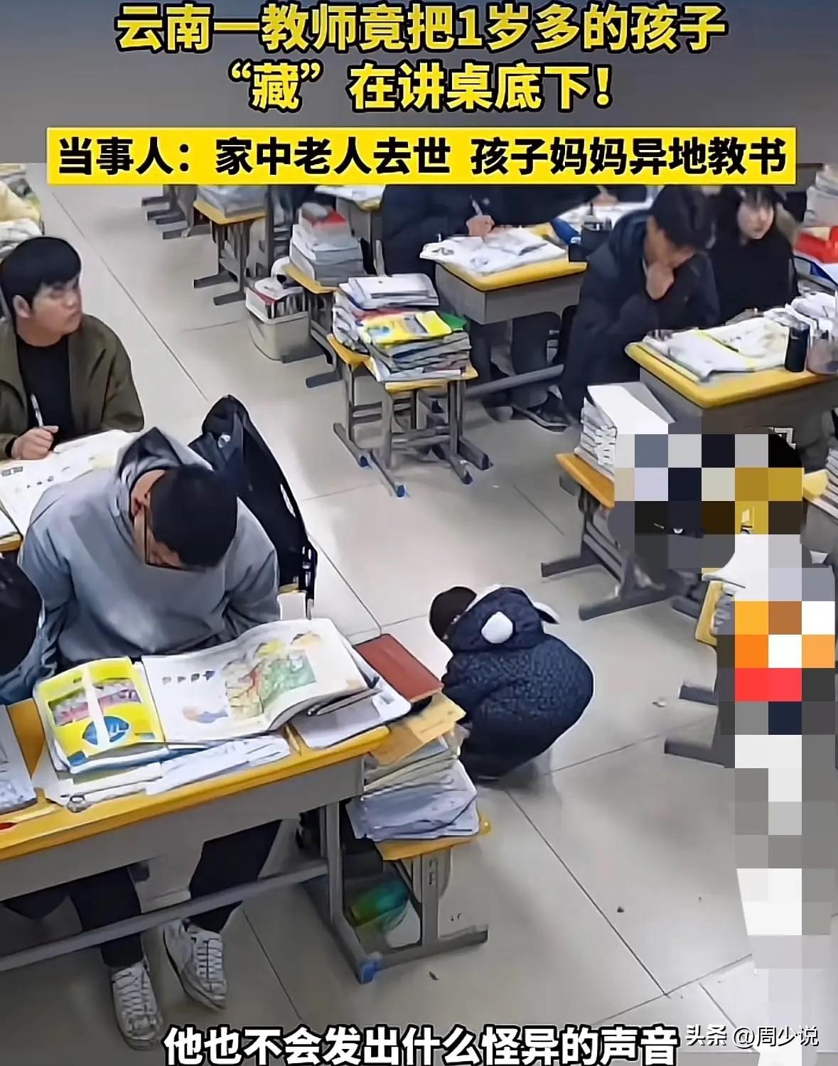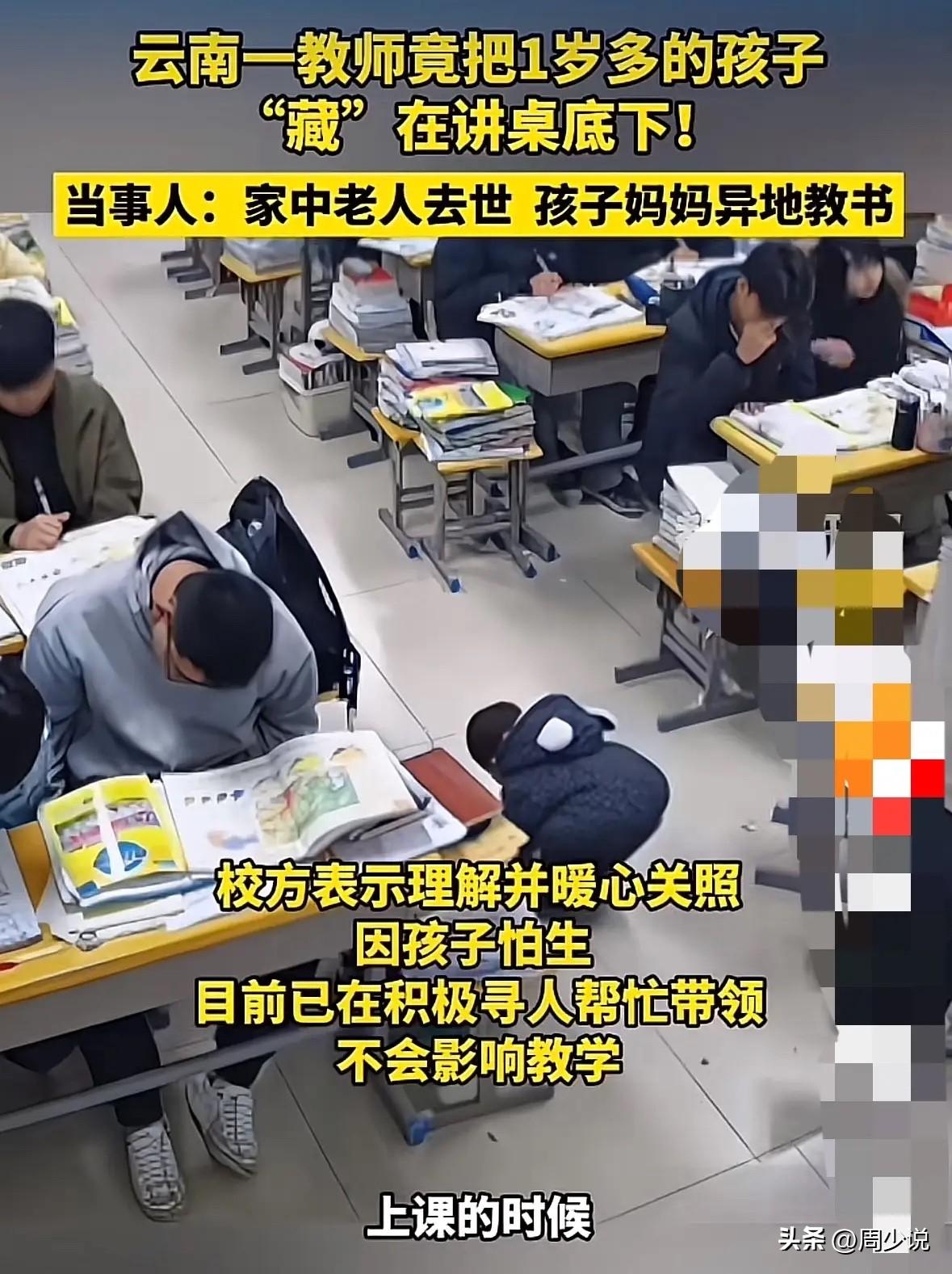 “泪目!”云南一所课堂的画面,让无数网友心头一紧:讲桌底下,一个1岁多的孩子安静蜷缩着,没有哭闹,而讲台之上,老师正专注地授课,仿佛身后的“小身影”从未存在。 这一幕被传网上后,很快引发热议。有网友心疼不已:“当老师的太不容易了,还要兼顾孩子,看着就鼻酸。” 也有网友感慨:“能把孩子藏在讲桌下坚持上课,这份责任心真的没话说。” 还有网友提出疑问:“特殊情况特殊对待,学校能理解就好。” 据当事人老师透露,他之所以让孩子待在讲桌下,并非刻意为之,而是实在迫不得已。夫妻长期异地,孩子一直由他照料,恰逢家中老人离世,家里临时没人帮忙照看孩子。而他又无法耽误课程,只能抱着孩子来到学校,因孩子怕生、在教室外会哭闹影响课堂,才临时让孩子躲在讲桌下,想着快速完成教学。 校方得知情况后,不仅对老师的做法表示理解,还暖心安排了同事帮忙协助照顾孩子,明确表示不会影响正常教学秩序。 在周少看来,这位老师的举动,恰恰诠释了“教师”二字的重量。在家庭突发变故、无人搭手的困境下,他没有选择请假耽误学生,而是用最笨拙、最艰难的方式,守住了课堂的责任。 这不是完美的处理方式,却是他在两难处境中能做出的最优解,这份对职业的敬畏和对学生的负责,本就值得被看见。 教育从来不是冷冰冰的规章制度堆砌,而是人与人之间的温度传递。老师在困境中对课堂的坚守,校方对老师的体谅,都是教育里最动人的细节。 这位老师的经历也提醒着我们,多一份理解,少一份苛责,就能让身处困境的教育者少些压力。毕竟,教育的本质是唤醒,而当老师被生活的难题温柔以待时,他们才更能把这份温柔传递给学生。 这一藏在讲桌下的守护,不仅藏着一位父亲的无奈,更藏着一位教师的初心,值得我们由衷点赞。#寻美三湘# #周少说教育# #寻美湖南#
