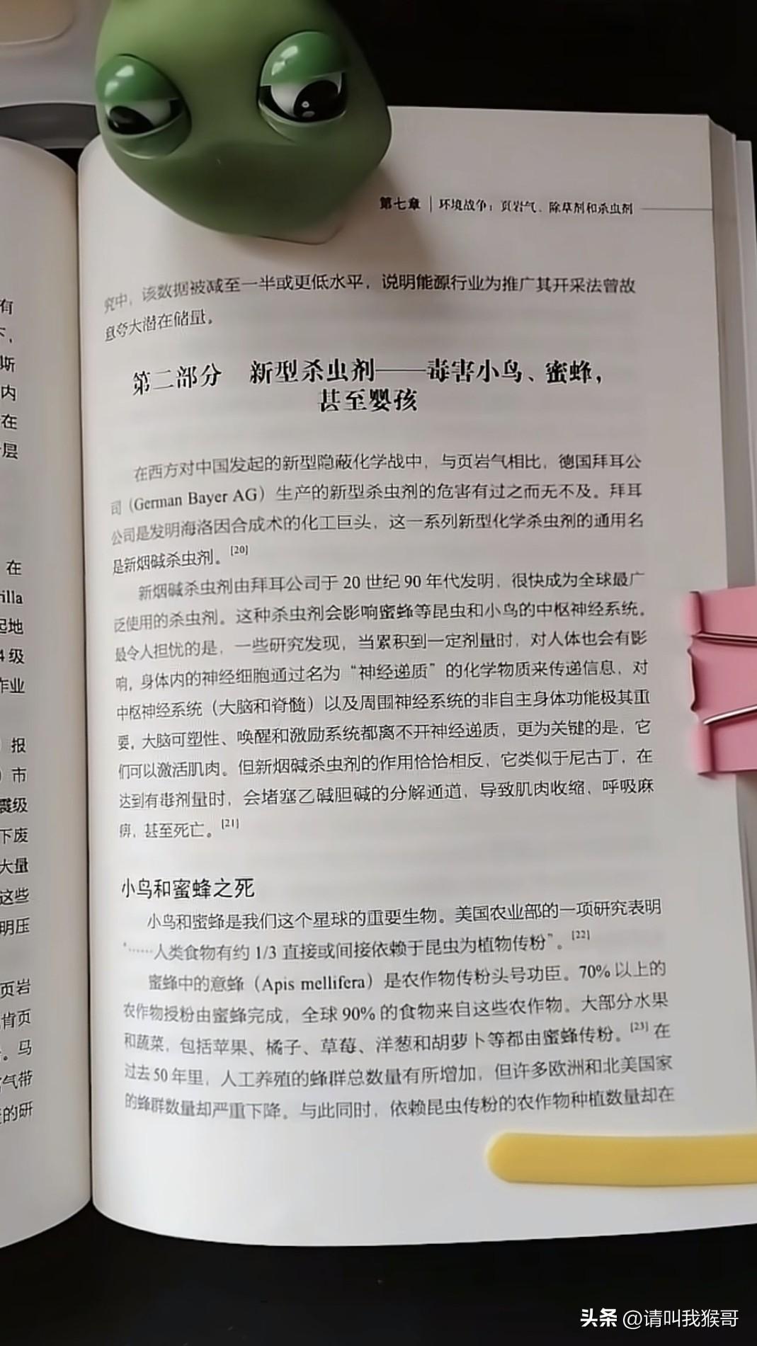 好巧不巧,今天在网上刷到一位博主展示的一本书,里面刚好讲到了关于蜜蜂和小鸟的消失对人类的危害。里面其中一篇便讲到了新型杀虫剂对小动物甚至人类的危害。这本书的作者是一位外国人,书被翻译成了中文并出版,主要是讲述老美针对我们采取的一系列手段。如果真如书中所言的话,那就有点太不可思议了,所以我们要时刻保持警惕!