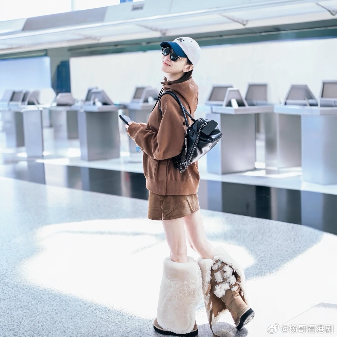 當日阿佘以一身滿滿少女感的造型亮相機場,只見她上身著啡色連帽衛衣,下身搭配同色系短裙,整套同色系穿搭簡約又出挑,亦十分契合香港當日約20度的和暖氣溫。而造型中最為吸睛的,莫過於她腳上一對厚身毛毛boots,明顯是為了應對北京當地10度以下的低溫做足準備。加上頭戴cap帽、架上黑超的搭配,盡顯精心打造的機場時尚感。值得一提的是,即便香港當日氣溫和暖,阿佘依然以露腿造型上機,面對即將抵達的低溫環境毫無懼色,相當勇氣可嘉。