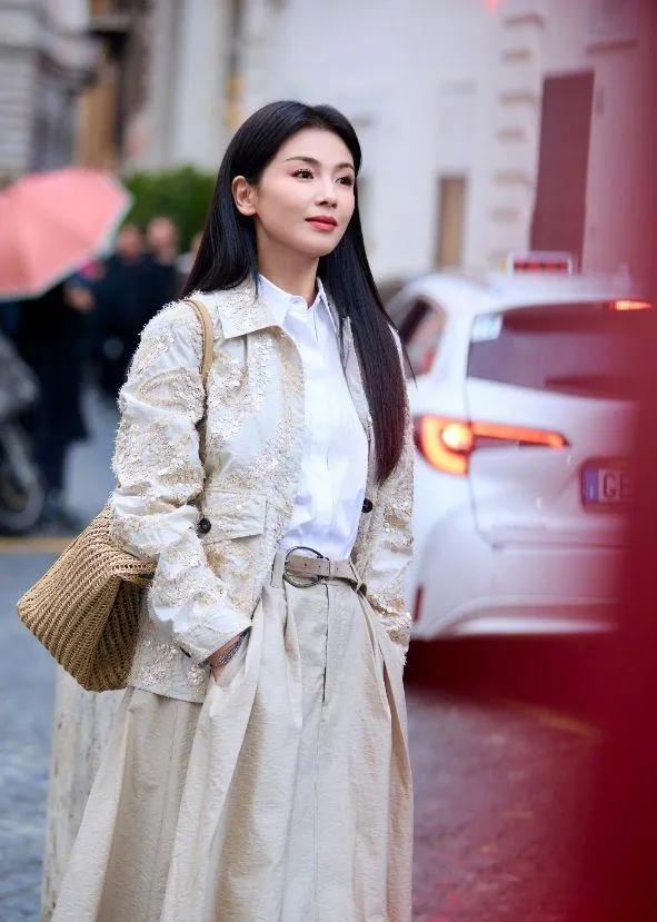 刘涛才是中年穿搭的天花板吧! 金绣外套+白衬衫+浅卡其半裙,温柔又显贵,草编包一