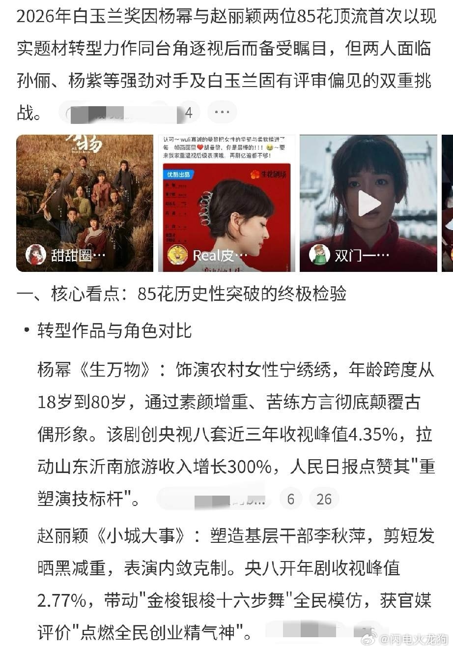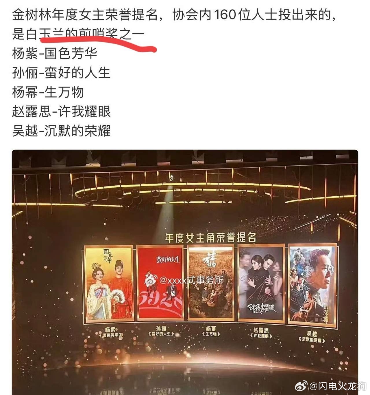 这样看来,白玉兰的视帝视后名单很有看点啊!要是最终颁给了杨幂和白宇,那就和前哨奖”雨露均沾”了。