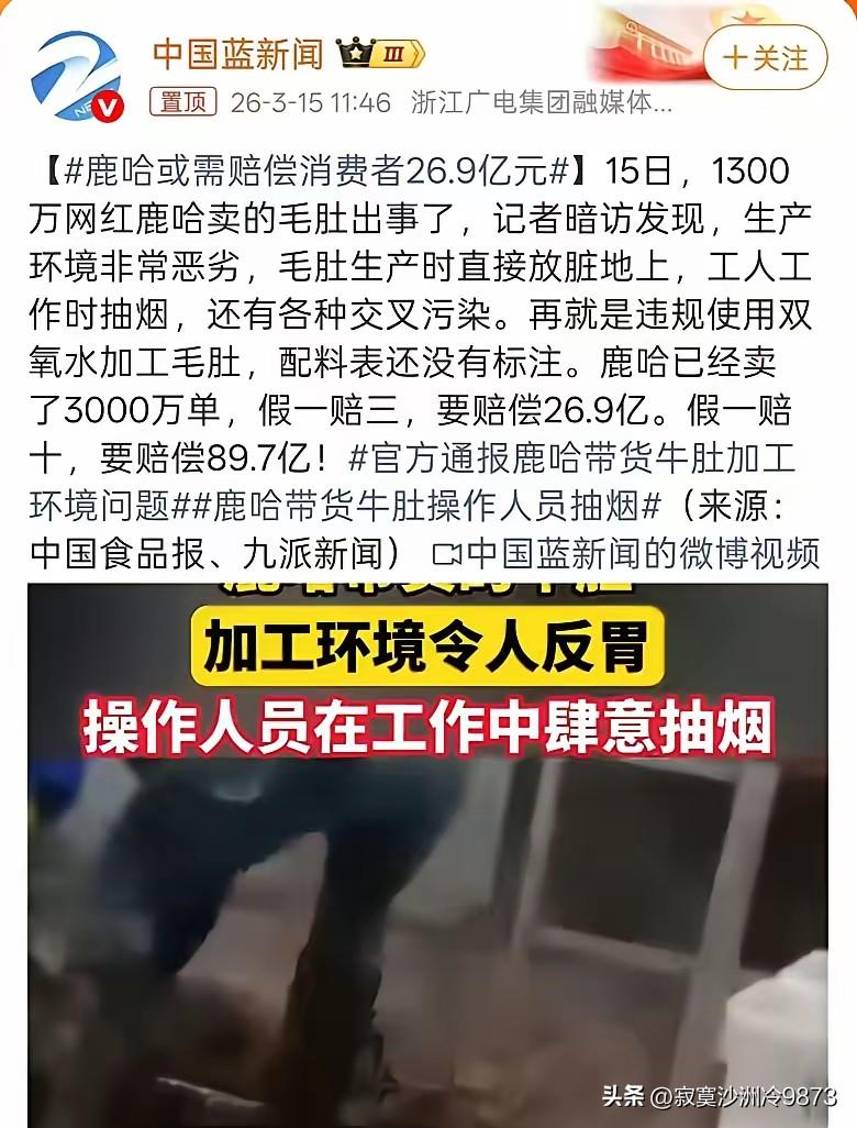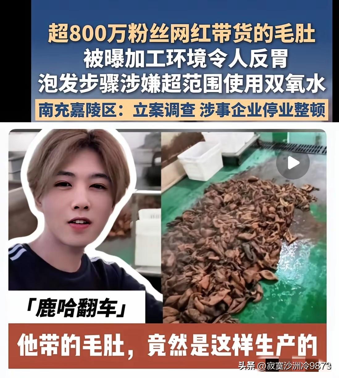 因长相与鹿晗极为相似,凭借模仿鹿晗而声名远扬的鹿哈,在这个特殊时间“塌房”了! 坐拥1300万粉丝的鹿哈,通过模仿明星鹿晗,进而成功带货,成为了人生赢家。 他不仅娶妻生子,事业也顺风顺水,然而最近却陷入了危机。他所带货的毛肚,经记者暗访后,被曝出加工环境脏乱差,还违规使用双氧水,涉事企业已被责令停业整顿。 而鹿哈在直播间售出了3000万单该毛肚,若按照假一赔三的规则计算,他需赔付20多亿元! 由此可见,哪怕是再知名的网红,也不能为了卖货而忽视产品质量。否则,下场必定凄惨!