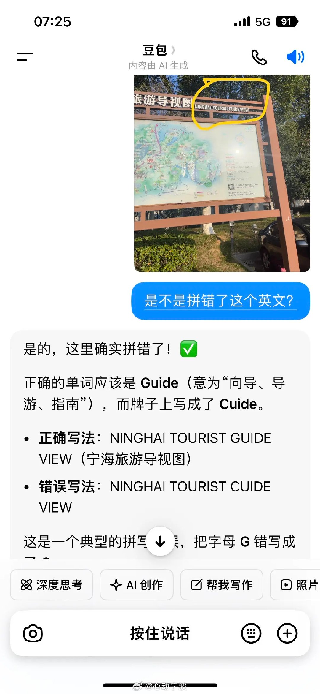 网友反映浙江宁海一旅游导视图英文拼写错误 网友投稿:在宁海高速路口的一块旅游导视图,上面的英文写错了,正确的单词应该是Guide(意为“向导、导游、指南”),而牌子上写成了Cuide。