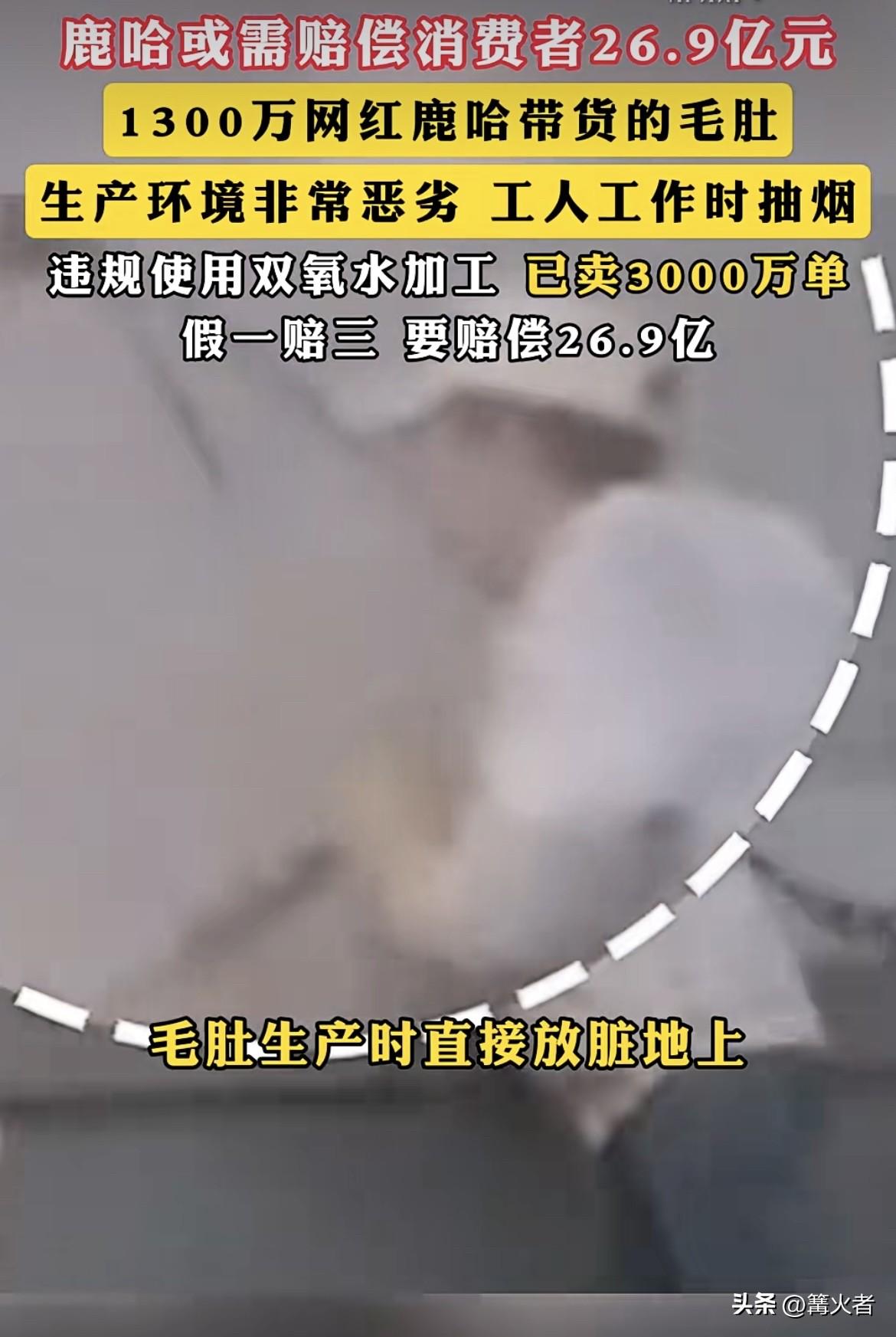 大网红1300万粉丝,带货的毛肚却出了大问题。暗访视频显示,生产车间那叫一个脏乱差,工人边干活边抽烟,煮好的毛肚直接摊在破地面上,还违规用双氧水加工,配料表却不标注,这毛肚已经卖了3000万单,按假一赔三算,得赔26.9亿,要是按直播间承诺的假一赔十,那就是89.7亿。这天文数字,估计鹿哈自己都懵了。