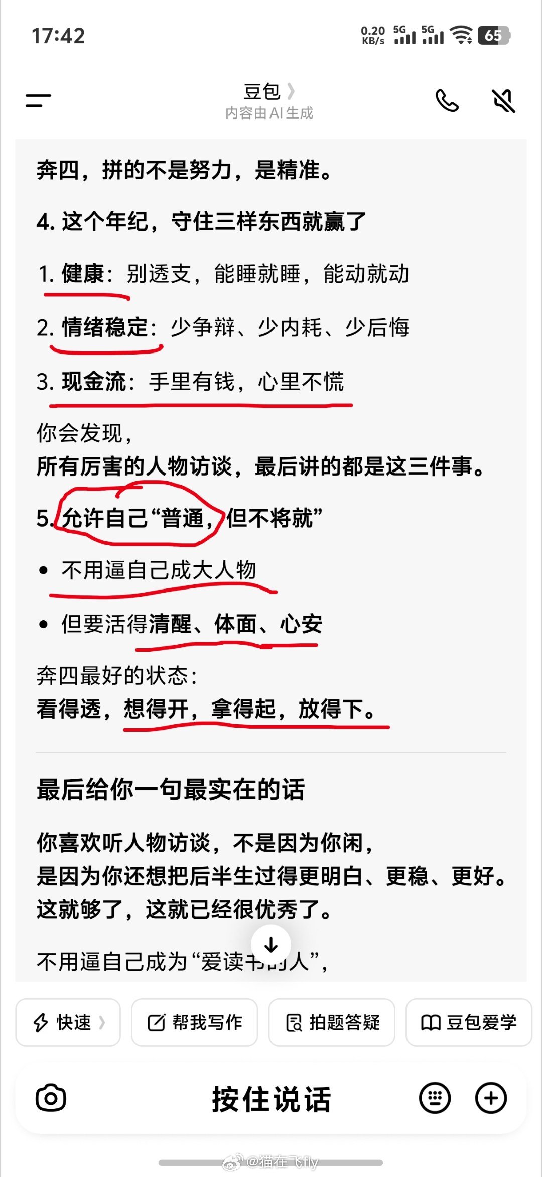 减重不是一件容易的事儿半途而废的太正常了光是我做的分享能记住的就中断了好多次不管是什么原因总是中断了后来又重新开始…………印象里最近一次打算好好减重是在8月13日,当时称的是74.3kg后来又是准备考试,又是过年,又是做眼睛手术(手术后1个月也不能高强度训练) 过年也是胡吃海喝的,锻炼也是断断续续,种种吧,就一直不太敢上秤,结果前几天称了下居然没胖,还降了一些,71.6kg。………… 没有持续有氧无氧,能想到的就是饮食改变带来的变化,因为家庭糖尿病史的缘故我不得不提前预防,按地中海式饮食,再做一些力量训练。 简单可坚持,对我是重要的。坚持先菜后蛋白最后来点碳水,也不管别人怎么看,做自己就行。 早餐可以两个鸡蛋+一杯豆浆,有时间就牛奶/酸奶泡点燕麦再来点黄瓜西红柿啥的。 午饭就是吃菜,鸡腿/鸡蛋再来点米,原来我不跟同事吃午饭,现在也开始和他们一起吃食堂,只不过我是要自己吃一大盘子菜,一小口米饭,食堂说不太好给准备杂粮,那我就自己准备,每天带一些。 下午茶就吃点坚果。 当然,奶茶啥的含糖的,我是拒绝的,除非是见朋友或者偶尔,奶茶对我是奢侈品。………… 好像说来说去就还是那些。 今天问了豆包一个问题,我说自己书看的少,还总是想看,现在尝试每天睡前看几分钟的习惯,最近好像蛮还蛮喜欢听人物传记的,这说明了什么。 它给我讲了一堆,恰好也是我想要的。 这样就挺好。