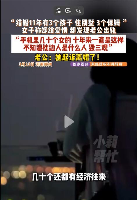 “11年真心喂了狗!”河南郑州,女子和丈夫结婚11年,住大别墅,有3个孩子,3个保姆,她在手机上看到丈夫和几十个女人的开房记录,经济往来和让她脸红心跳的视频后,愤怒地质问丈夫,丈夫却两手一摊:“男人不都这样玩吗?”她质问其中一个女人,那人轻飘飘地说:“我不勾引他,多的是人勾引他!” 郑州那栋带院子的大别墅里,杨女士过了整整11年"人生赢家"的日子。三个孩子,三个保姆,老公做建材生意赚得盆满钵满。朋友圈里晒的全是全家福,配文永远是"感恩有你"。 直到3月13日前的那个深夜,一切都碎了。 老公喝得烂醉,手机在客厅充电时突然亮起。杨女士顺手一看,屏幕上跳出来的微信消息让她手抖得像筛糠——是个女人发来的亲密照,语气嗲得发腻,问他什么时候再"约"。 她点开聊天记录,整个人瘫坐在地上。转账流水像自来水一样,一次几千上万。开房记录堆成山。还有那些让人没眼看的视频。更要命的是,这样的女人不是一个两个,而是几十个。 她冲进卧室质问,以为能等来一句道歉。可丈夫只是淡淡瞥了一眼,语气平淡地说:“这没什么值得大惊小怪的。”成功男人不都这么玩吗?" 他甚至理直气壮地摊开手:"我差你钱花了?保姆请着,好吃好喝养着。我在外面就是逢场作戏,只要家里不倒不就行了?" 杨女士气得发抖,偷偷找了其中一个女人理论。对方态度更是傲慢:“姐,就算我不靠近他,对他有好感的人,多得都能绕小区好几圈了。你自己没本事看住老公,怪谁?" 这句话像一把刀,直接捅穿了她最后的体面。 更让她心寒的是,后来送菜的阿姨才跟她提起,丈夫在外的不当行为,其实整个小区早已人尽皆知,唯独她一直被蒙在鼓里。物业保安、公司工人、甚至她那些所谓的闺蜜,全都知道。只有她一个人,住在豪宅里,像个装在精致盒子里的木偶,被耍了整整11年。 她想起自己以前在朋友面前炫富、在朋友圈晒幸福的样子,恨不得找个地洞钻进去。原来全天下都在看她笑话,她才是那个最可怜的傻子。 这个男人给她的大别墅和保姆,从来不是因为爱,而是为了养一个"招牌",好让他在外面浪得没有负担。在他看来,婚姻更像是一场等价交换:我为你提供物质支撑,你为我打理好生活与家庭。至于忠诚?那不在合同里。 杨女士现在彻底清醒了。11年的真心虽然喂了狗,但好在人还没疯。3月13日,她正式起诉离婚。老公依然强硬:"既然起诉了就去法院谈,让法律判。" 网上吵翻了天。有人劝她赶紧离:"趁他还有钱,拿走你应得的那份,带着孩子过自己的日子。"也有不少人劝道:“三个孩子还小,分开了实在让人心疼,不如就多包容一些,为了孩子将就着过日子。”" 但杨女士心里明白,这不是钱的问题。一个把出轨当成功标配、把妻子当摆设的男人,账户再多钱,精神上也只是个穷光蛋。 她要的不是继续住在这栋豪宅里当个高级保姆,而是拿回属于自己的尊严,体面地离场。 那几十个女人和这个男人,就让他们在泥潭里互相折腾去吧。 参考信息:河南一女子结婚11年有3个孩子,住别墅配有3个保姆,翻丈夫手机发现出轨几十人,目前已起诉离婚 2026-03-15 12:11·闽南网