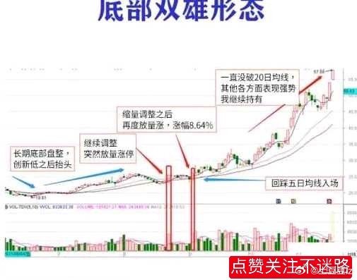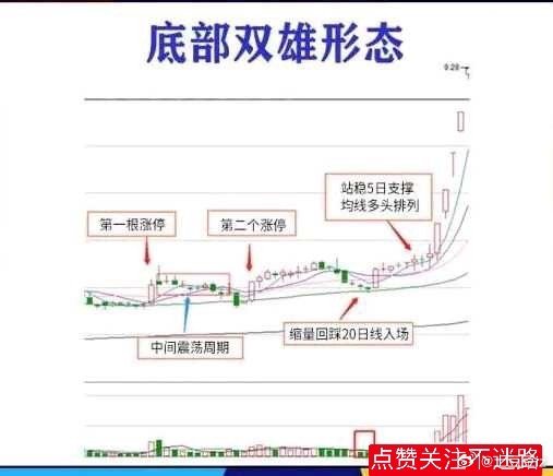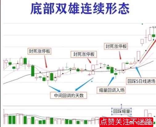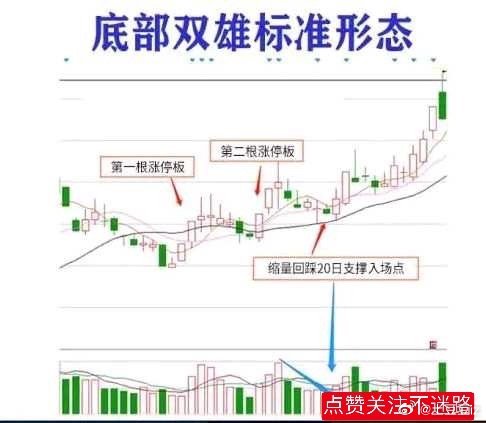 “底部双雄”含义所谓底部双雄是指当一只股票在底部区域突然出现一根大阳线甚至是涨停板,然后经过一段时间的缩量调整。接着再次出现一根大阳线甚至是涨停板,这样的K线组合就构成了底部双雄形态。在底部出现涨停是主力所为,回踩后再次涨停充分反映了主力的控盘程度和拉升意愿,这种形态是强势股在底部吃货和洗盘时常见的经典形态。如果发现这种形态要重点关注,是否马上拿进要视大盘当时的情况以及目标股所处行业板块、题材等,但可靠性已经相当高,只是涨幅和涨速的问题。涨停双响炮:就是前面有涨停出现,涨停过后经过短周期的调整(一般三天到一个月为宜,最好是在两周之内出现),再次出现涨停,即"涨停+调整+涨停",而且后涨停打出的高度高于前涨停。也就是说,这是一种"涨停+"的模式,但在后涨停之前不会出现连续的拉升。战法要点:(1)股票结构处于底部或上涨初期。(2)回调过前面涨停前的最低点(前一个涨停前,下跌阶段的最低点,也就是回调不能创新低)。(3)调整周期交易日在23日内(长假除外)。注意事项:第一:股价位置如果涨停双响炮出现在股价的底部阶段,那么这种走势,遇到了就是福报,好好珍惜就是了。如果是在高位出现双响炮,那要注意观察量能的变化,可能是股价在筑顶,如果换手率过高,暂时离场不失为明智之举。第二:成交量变化最好是阳线的时候放量,随后的几根阴线回调缩量。说明主力还在里面,这个时候把握更大。第三:回调时间第一根阳线之后的回调时间一般在5天左右,时间太长,可能烂尾,此时要注意止损离场。下面我把底部双雄的技术形态整理成6幅技术图形,放到文章的最后方,为了加深大家的理解,我详细的在图片上做出说明,希望可以帮助到大家。