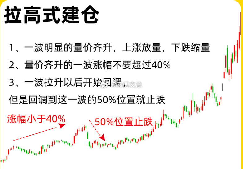 二、拉高式建仓也算是主力强势抢筹建仓。股价脱离底部区间以后,股价快速拉升,出现连续放量上涨,可能会出现首板涨停,股价快速突破上方压力位。这种建仓方式比较激进,所以建仓的时间周期就会比较短,整个建仓走势,就会形成快速拉升,微调下跌的走势,股价逐步抬高,那么均线就会形成多头趋势,斜率向上