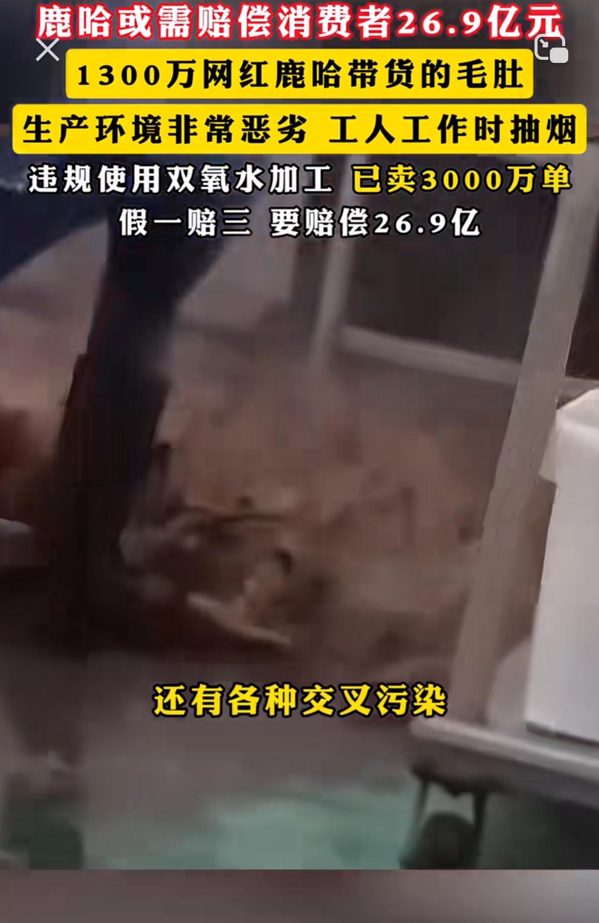 2026年315,网红鹿哈带货翻车事件闹得沸沸扬扬,“鹿哈需赔26.9亿”直接霸榜热搜。他直播间卖的即食贡菜千层肚,生产环境那叫一个脏乱差:地面破损积水,食材随意堆放,工人边抽烟边作业,烟灰还直接掉进原料里,甚至违规用双氧水泡发还隐瞒配料。 这款单价约9元的问题毛肚,在他直播间卖了3000万单。按“假一赔三”,得赔26.9亿;“假一赔十”的话,赔偿高达89.7亿。这事儿给整个直播行业敲响了食品安全和诚信经营的警钟,主播选品可得上点心了,不然一不小心就赔到倾家荡产!