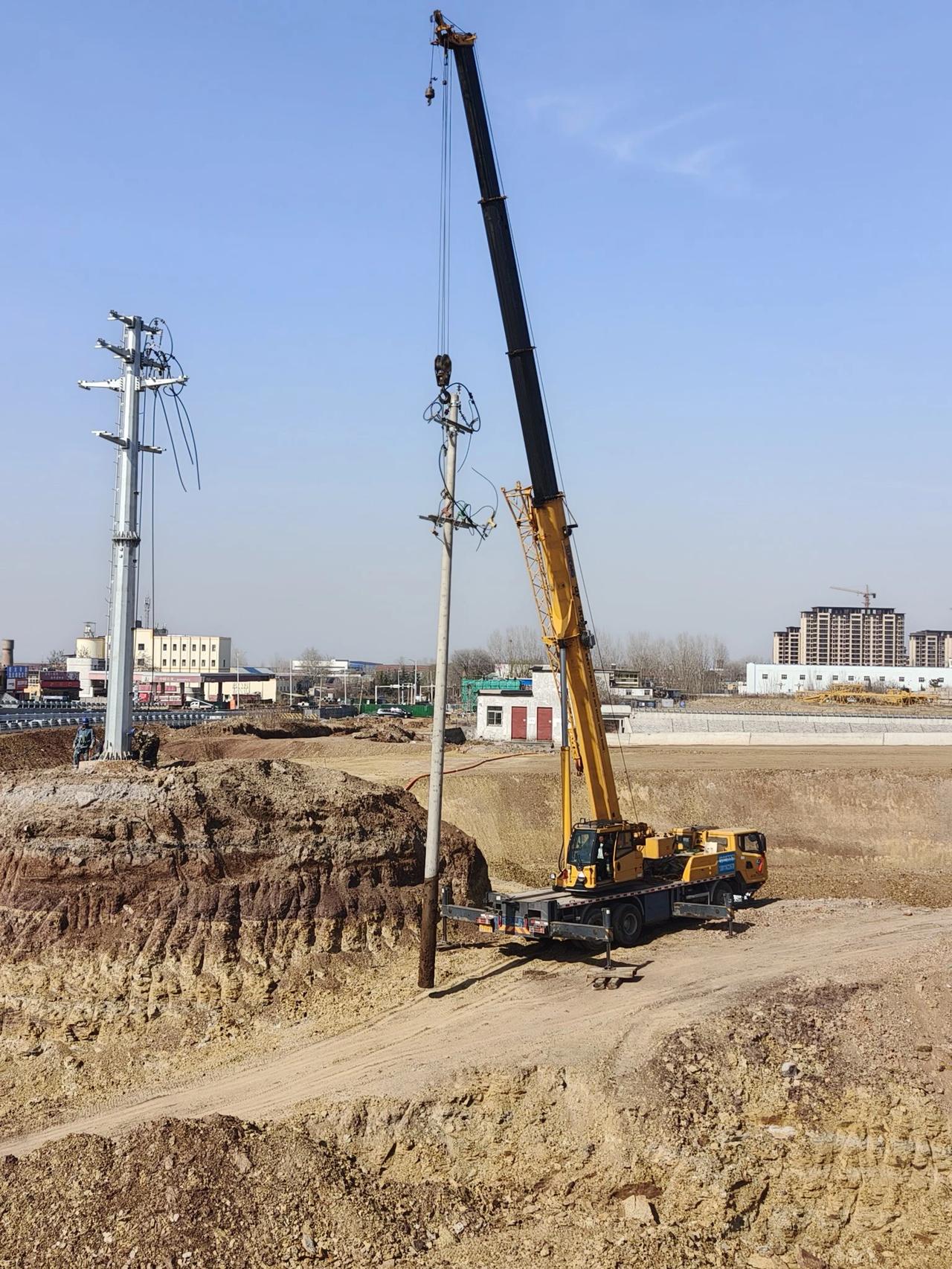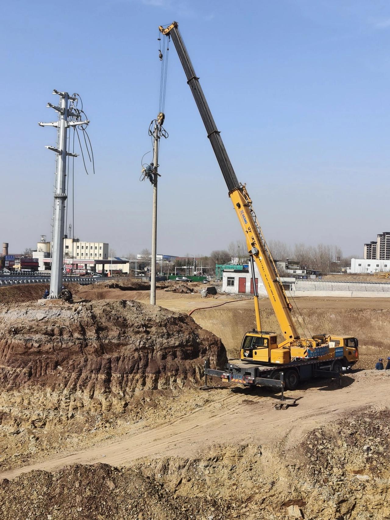途径淄川立交桥的高压线开始拆除! 为加快淄川立交桥施工进度,争取早日全部建成通车,经过多方工作协调,有关部门密切配合,精心组织人员安排,详细制定施工方案,途径淄川立交桥上空的高压线,近日正式开始拆除。