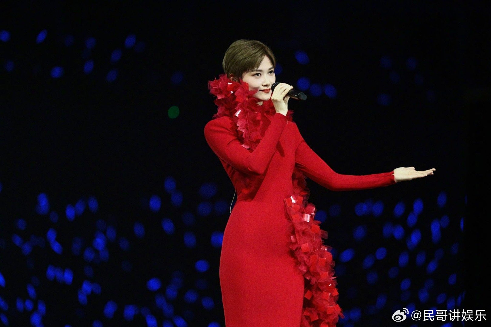 李宇春演唱会新造型亮相李宇春上海演唱会新造型惊艳亮相,裸背红裙宛如花神降临,金色