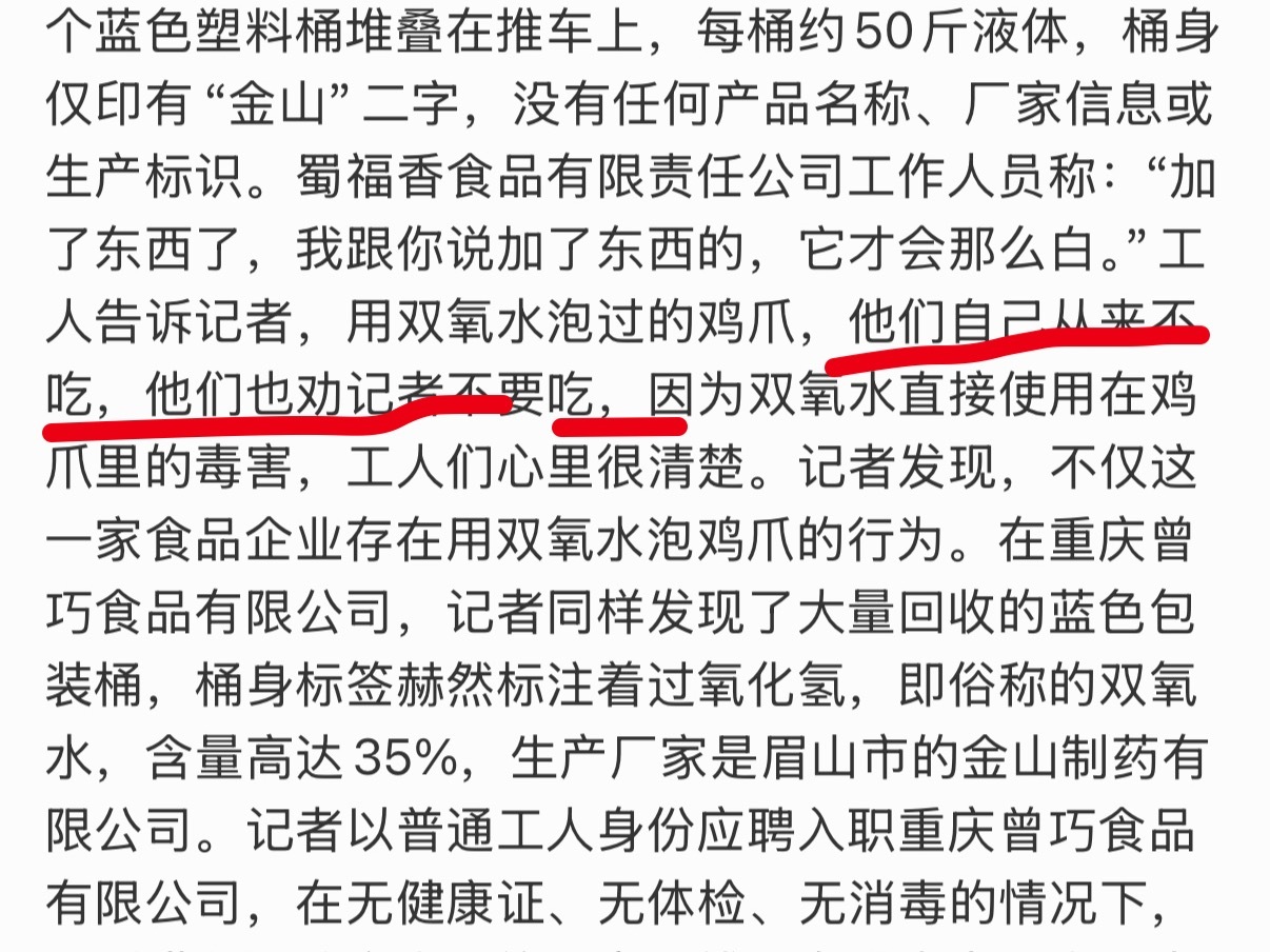 “制作的工人从来不吃,也劝记者不要吃”,他们明知道双氧水泡过的鸡爪不能吃,却还要