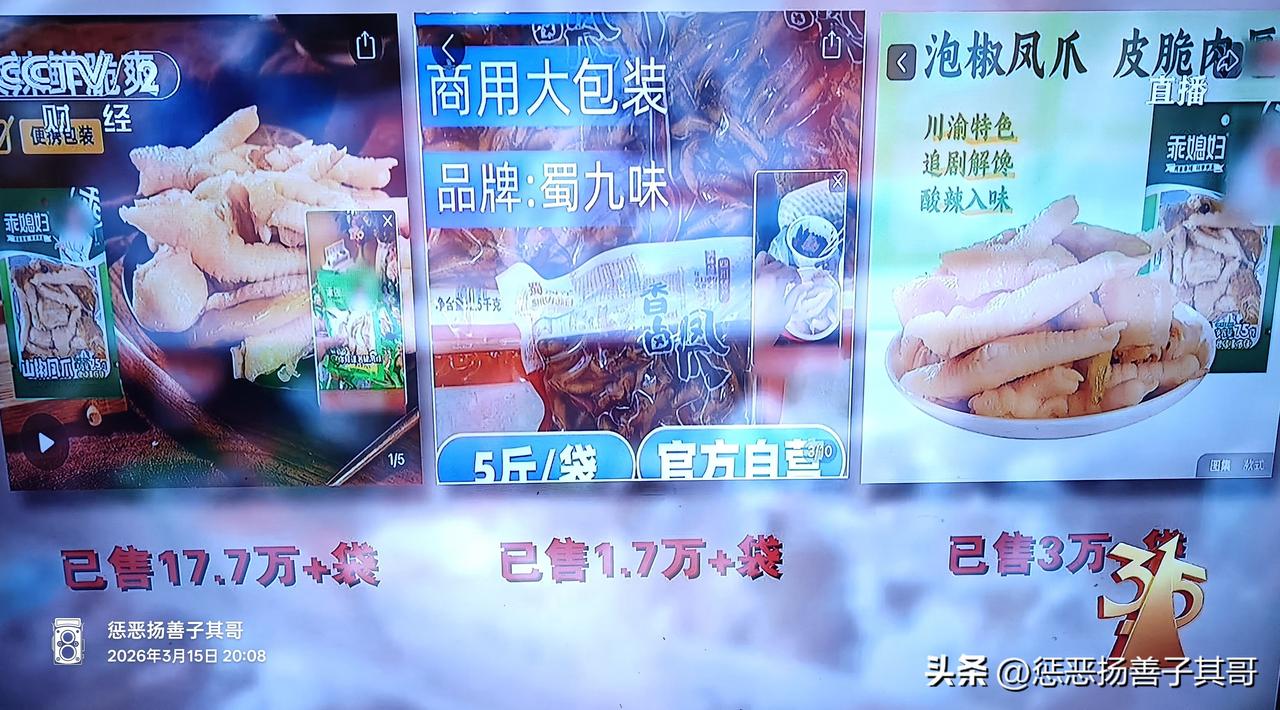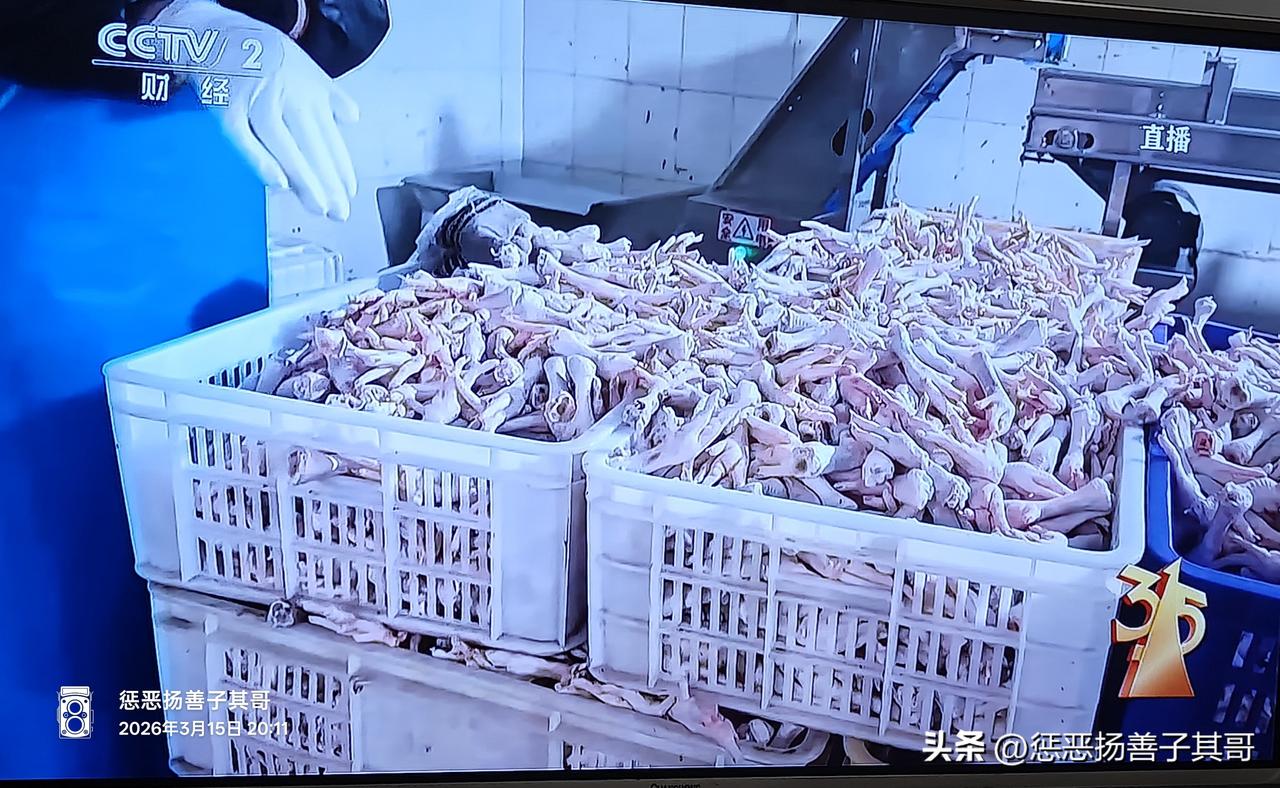 今晚的“3.15”晚会曝光的第一个案件:双氧水漂白的鸡爪。 500克售价不到10元。记者暗访成都一家加工生产鸡爪的作坊。白晶晶的鸡爪全是用双氧水泡过的,生产工人自称他们从不会吃。 所以,消费者无论在什么超市买鸡爪,遇到那种白白胖胖的鸡爪,千万不要买。 对这种残害消费者的商家必须让它倾家荡产,负责人判死刑!